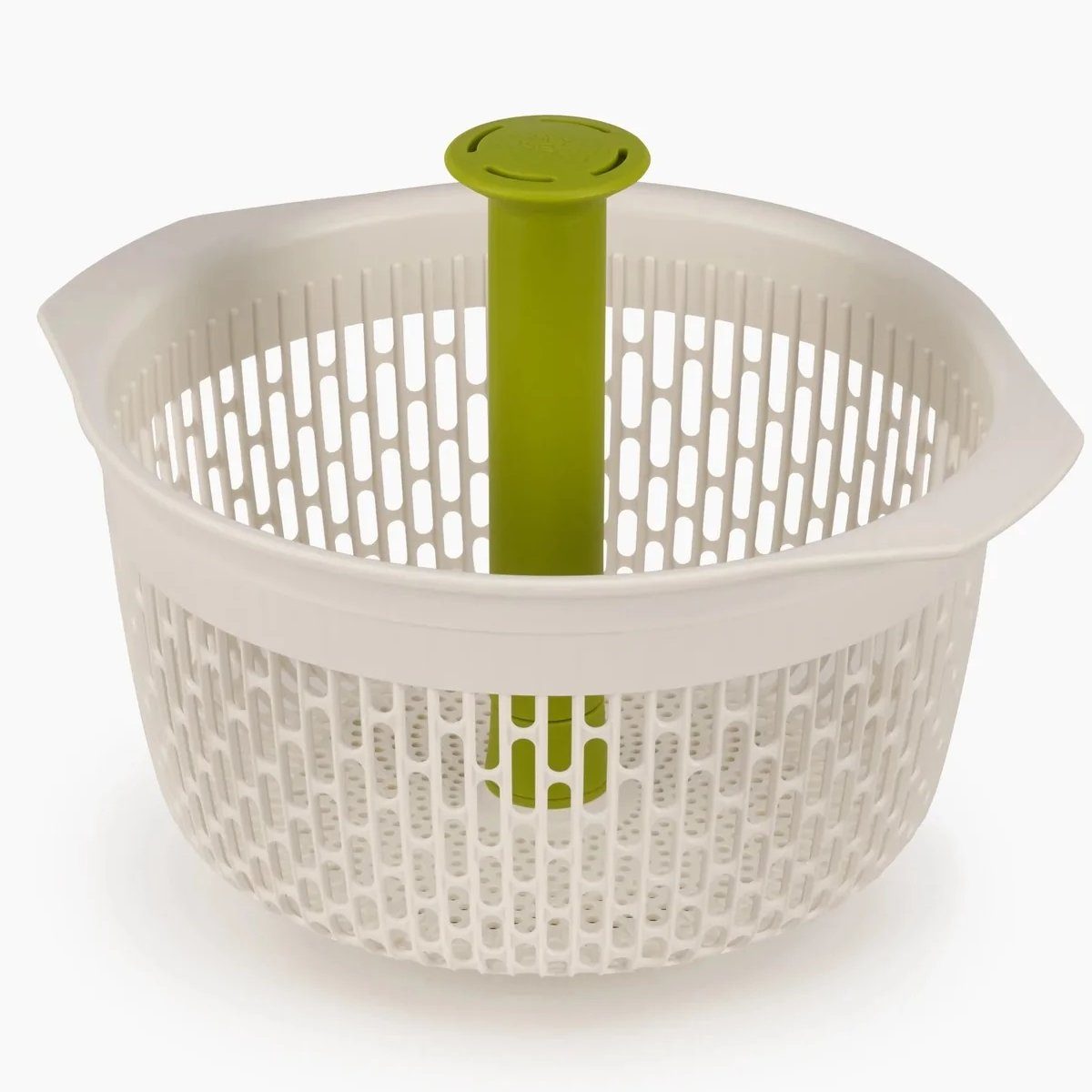 Spindola™ von Joseph Josseph besteht aus einer cleveren Kombination von Salatschleuder und Sieb in platzsparendem Design. Für die Zubereitung von Salaten befestigen Sie die Spindel und den Sauger (vorher anfeuchten) am Korb, geben das Grünzeug hinein und spülen es wie gewohnt unter dem Wasserhahn ab. Anschließend befestigen Sie das Sieb mit dem Saugnapf am Spülbeckenboden und pumpen die Spindel auf und ab, um den Korb zu drehen und überschüssiges Wasser direkt in der Spüle sauber herauszudrücken.