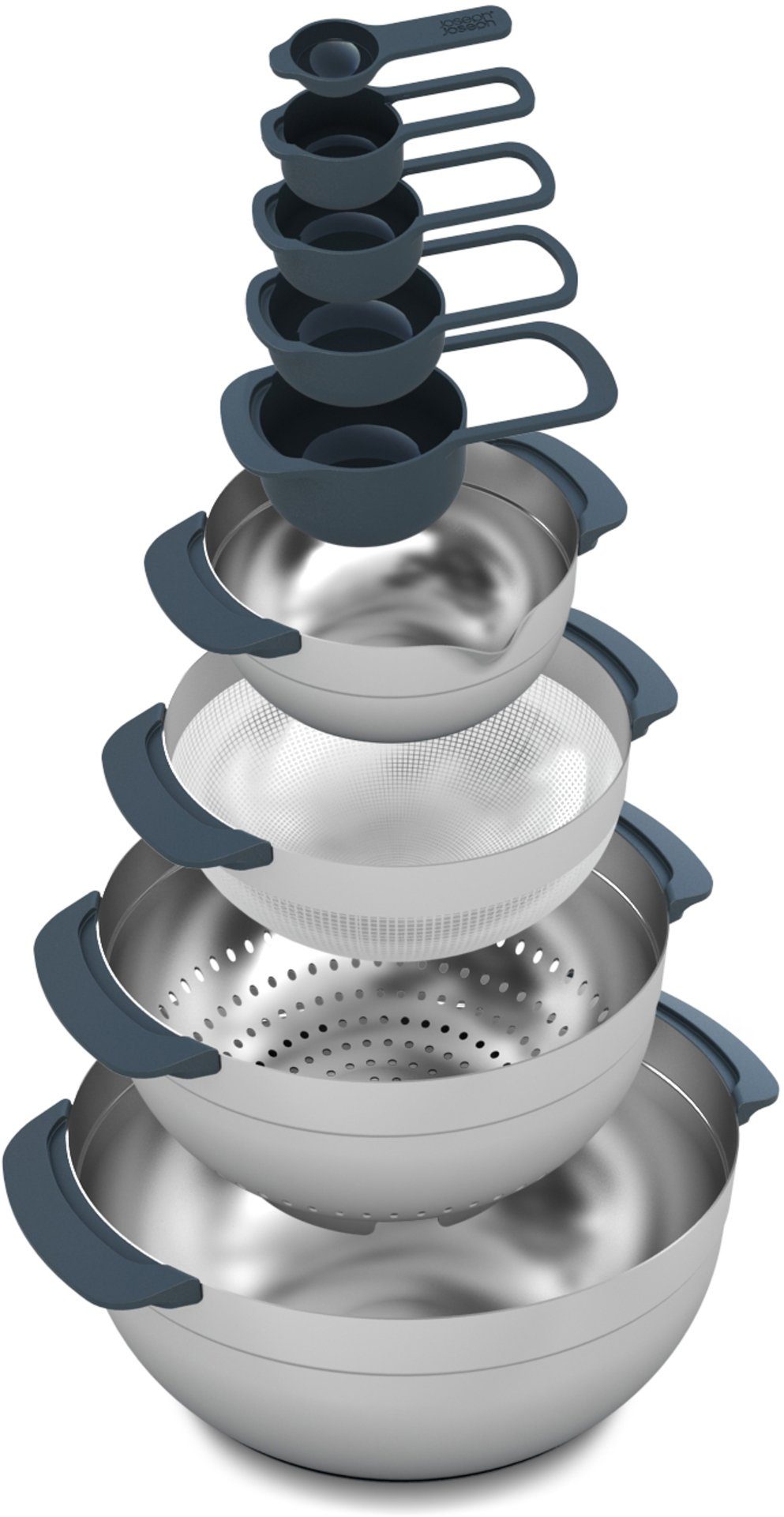 Die Joseph Joseph 100-Kollektion ist eine einzigartige Produktreihe, die speziell aufgrund ihrer originellen Form und innovativen Funktion ausgewählt wurde. Für diese exklusive Kollektion wurde jedes Produkt mit hochwertigen Materialien und einer zurückhaltenden Farbpalette definiert, um ein unverwechselbares Меню an zeitgemäßen Küchenutensilien zu kreieren. Für dieses edle Rührschüsseln-Set wurde die 100 Kollektion mit der Nest™ Kollektion verbunden. Diese Linie von Joseph Joseph umfasst überaus praktisches, platzsparendes Küchengeschirr mit einer einzigartigen Reihe von Sets zur Speisenzubereitung. Dank ihres innovativen Designs können die einzelnen Elemente ineinander gesteckt werden, wodurch sie nur sehr wenig Platz benötigen − ganz gleich, wo sie verstaut werden. Das Set besteht aus 9 verschiedenen hochqualitativen Schüsseln aus 18/10 Edelstahl. Das Set enthält zwei Rührschüsseln (4,5 und 0,5 Liter), ein Durchschlag (3 Liter), ein Sieb (1,65 Liter) und 5 Messbecher in verschiedenen Größen. Spülmaschinegeeignet.
