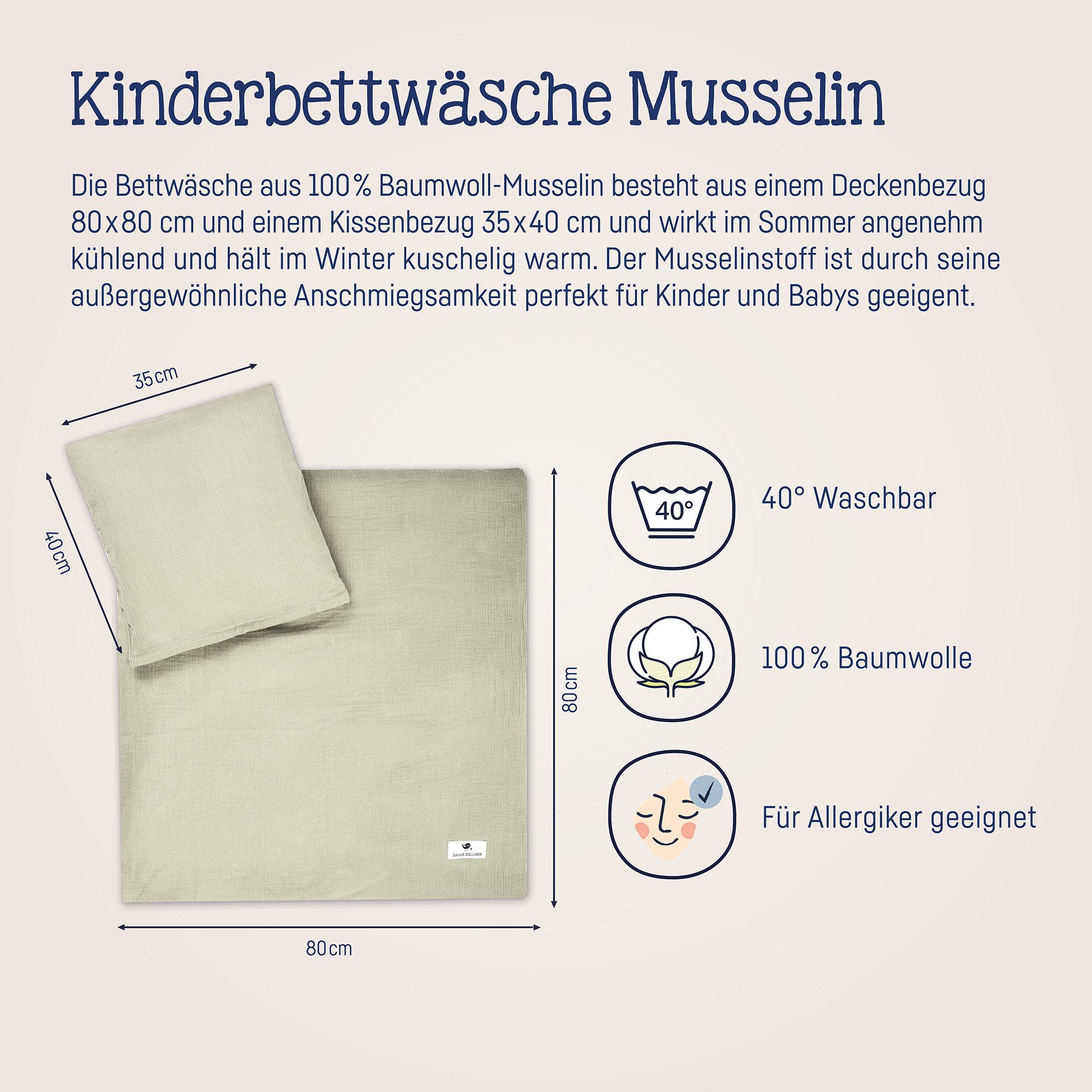 Die leichte Bettwäsche aus 100% feinem Baumwollmusselin wirkt im Sommer angenehm kühlend und hält im Winter kuschelig warm. Der Musselinstoff ist durch seine außergewöhnlich hohe Saugfähigkeit und Anschmiegsamkeit das perfekte Material für Babytextilien. Die Bettwäsche ist mit einem robusten Reißverschluss versehen und lässt sich leicht aufziehen. Die Bettwäsche besteht aus 100% Musselin-Baumwolle und ist in Duetschland hergestellt. Schadstoffgeprüft nach und für Всеrgiker geeignet.
