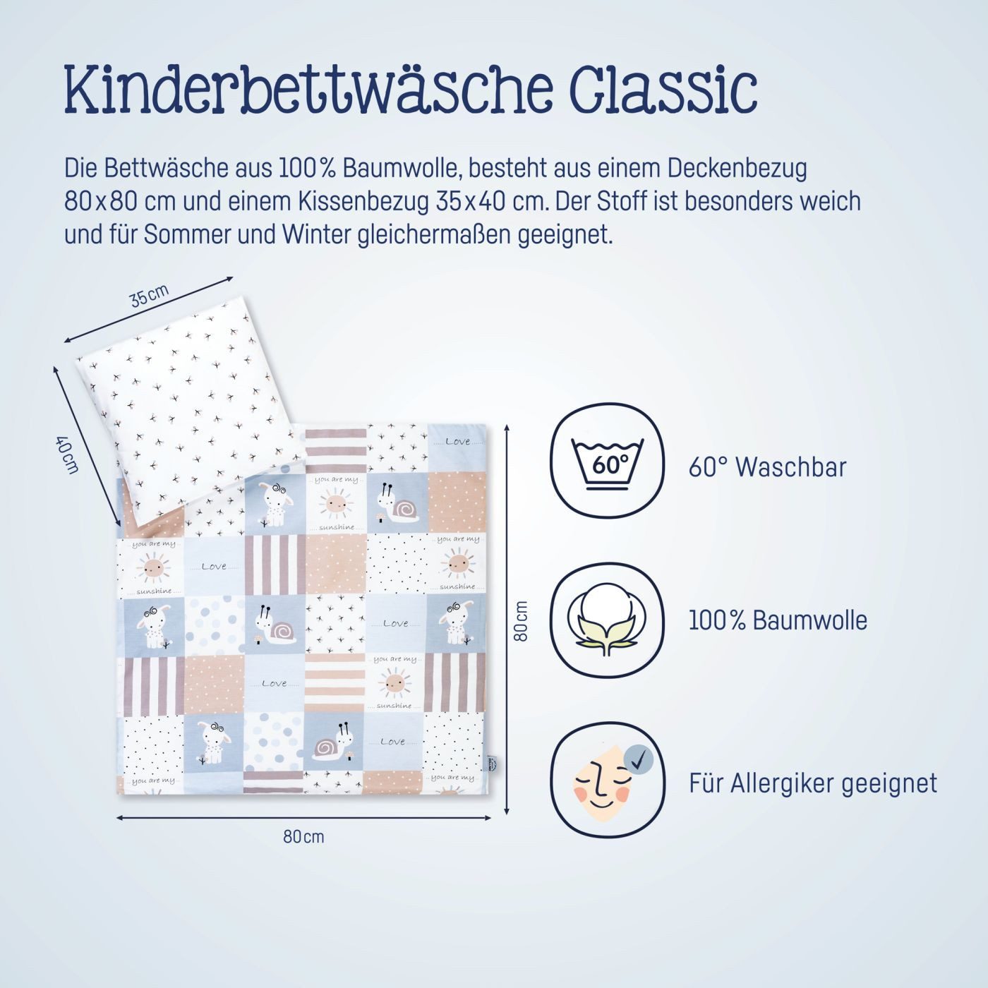 Die angenehm weiche und dennoch strapazierfähige Bettwäsche aus 100% Baumwolle besticht durch das liebevoll gestaltete Design und sorgfältige Verarbeitung. Die Размер 80x80 cm ist für Wiegen, Stubenwagen und Kinderwagen geeignet. Die Размер 100x135cm passt in Babybetten der Размер 70x140cm und 60x120cm. Die Bettwäsche ist mit einem Reißverschluss versehen und lässt sich leicht aufziehen. Die Bettwäsche wurde in Deutschlanf hergestellt. Die Bettwäsche kann bei 60°C in der Waschmaschine gewaschen werden und ist für den Trockner geeignet. Schadstoffgeprüft nach und für Всеrgiker geeignet.