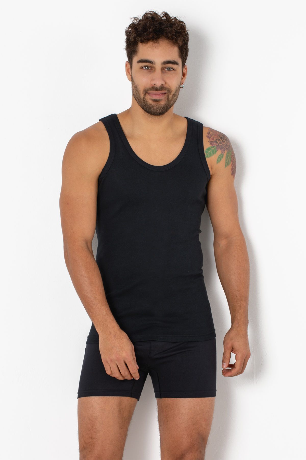 Mit seinem eleganten und zeitlosen Design ergänzt unser Unterhemd mühelos jedes Outfit. Ob Sie es unter einem Hemd für einen formellen Anlass tragen oder es mit Jeans für einen lässigen Look kombinieren, dieses Unterhemd verleiht Ihrem Ensemble einen Hauch von Raffinesse. Seine schwarze(n) Farbe(n) bieten eine klassische und vielseitige Option, die gut zu jeder Farbkombination passt.