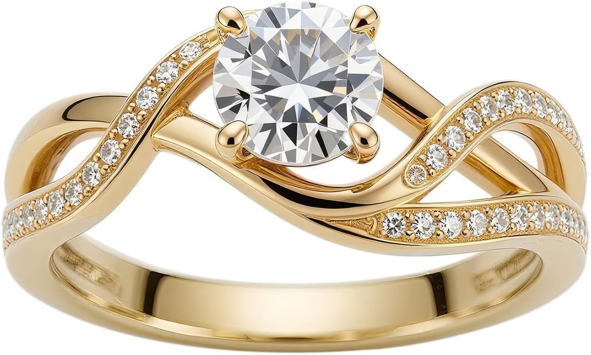 Die Ringfassung besticht durch ein gewebtes Rattandesign, in dessen Mitte ein Diamant im Rundschliff sitzt, der Schönheit und Eleganz ausstrahlt.