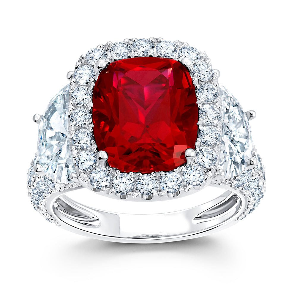 Material: 14K Weißgold, besetzt mit einem 5-Karat-Rubin und mehreren klassischen runden Labordiamanten der Reinheit D/E VVS/VS.