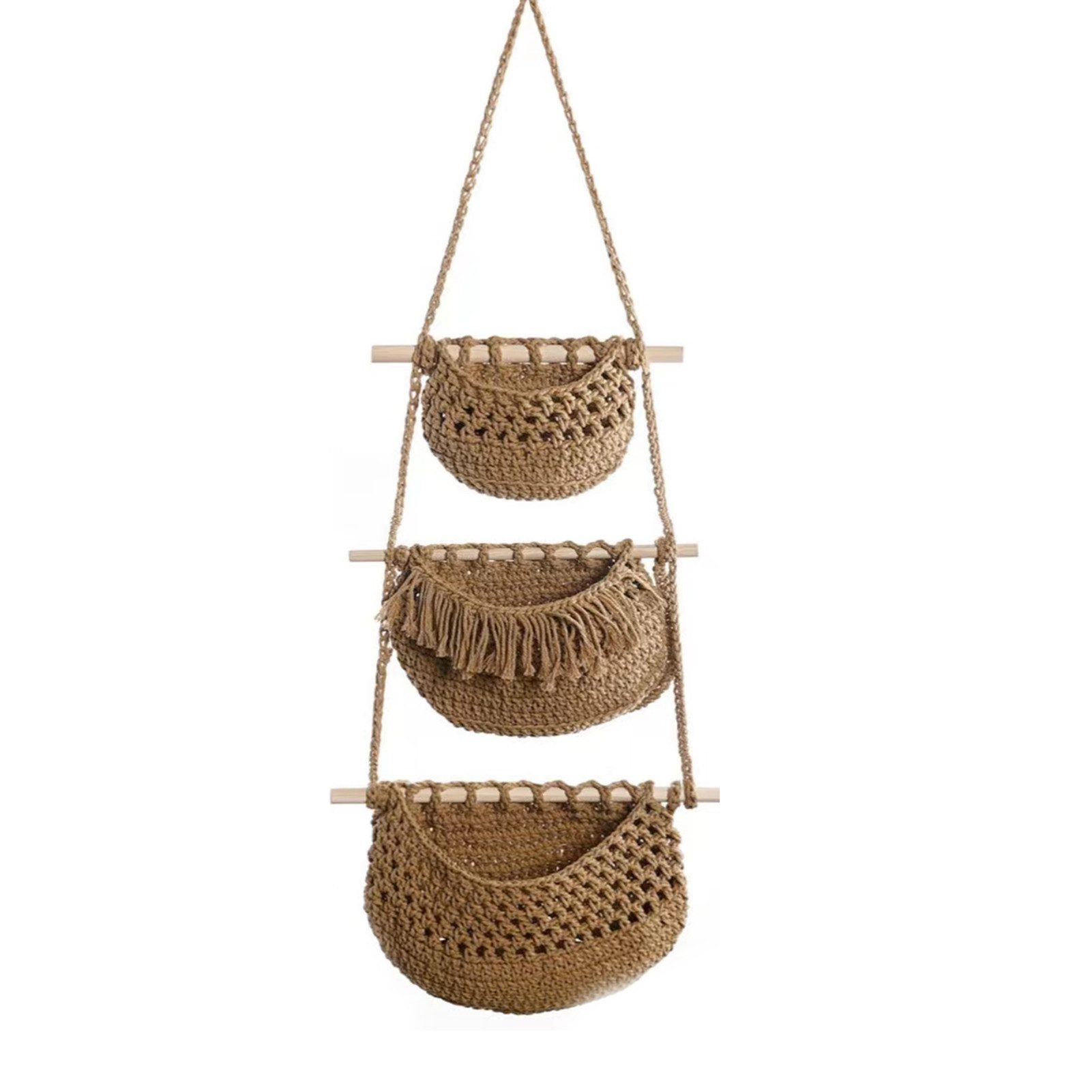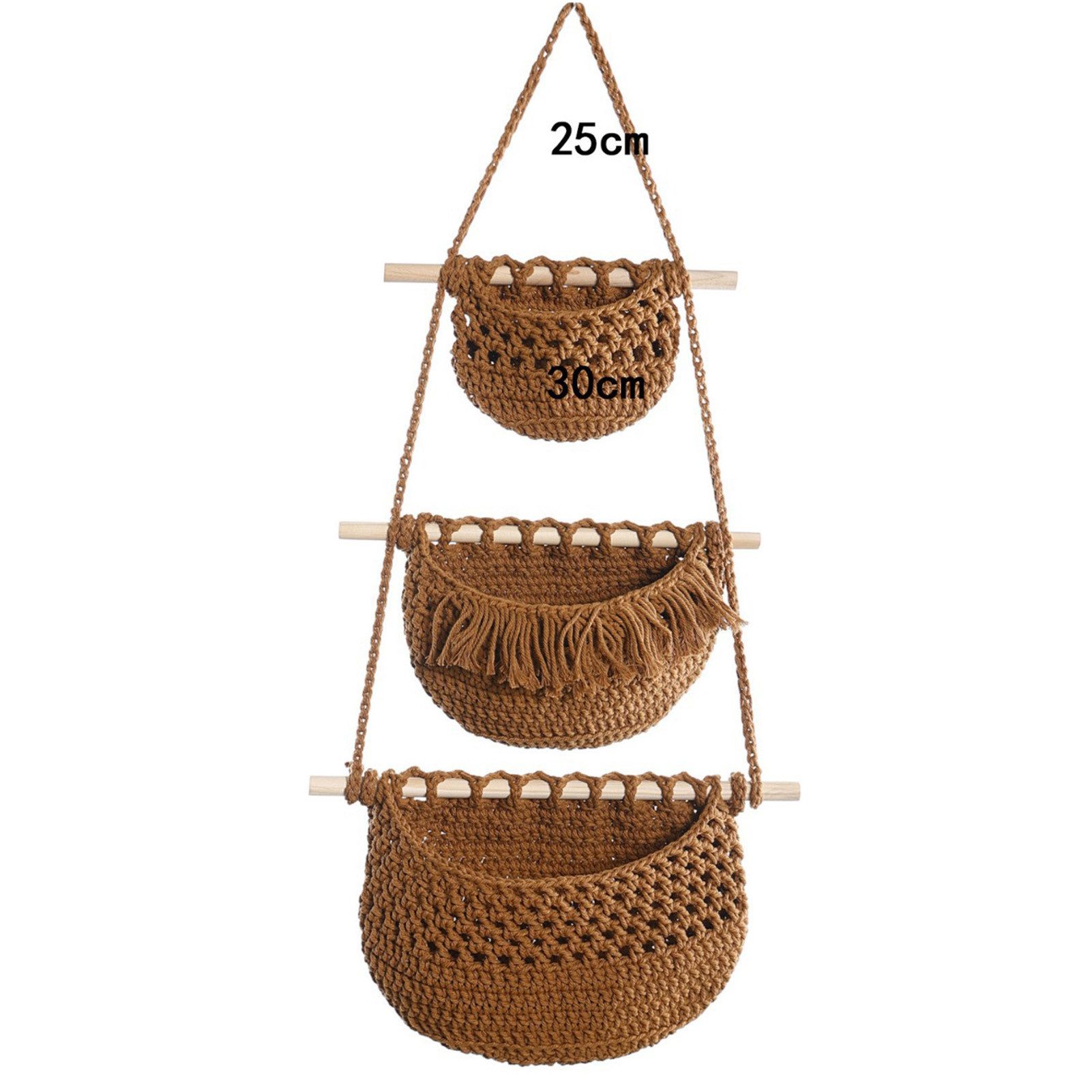 Unsere dreifachen Netztaschen sind handgeflochten, aus reiner Baumwolle ohne synthetische Fasern. Sie fühlen sich warm an und eignen sich für eine Vielzahl von Verschönerungen im Wohnbereich. Jeder Korb ist sorgfältig gewebt und zeigt eine natürliche und rustikale Schönheit. Die Quasten an der Oberseite verleihen dem Korb nicht nur Stil, sondern auch einen Hauch von Eleganz. Der Korb ist so konzipiert, dass er aufgehängt werden kann, wodurch er ideal in Räumen wie der Küche, dem Balkon oder dem Wohnzimmer platziert werden kann, um Ihrem Zuhause eine besondere Note zu verleihen. Ganz gleich, ob Sie ihn zur Aufbewahrung von Besteck, Büchern oder als Dekorationsobjekt verwenden, dieser handgeflochtene Korb (3-teilig) bringt einen Hauch von Natur und Komfort in Ihr Leben. Er ist ideal für Ihr Zuhause und ein schönes Geschenk für Ihre Freunde und Familie. Die Spezifikationen sind wie folgt: Material: Baumwollseil Größe: 33*80cm (beige), 33*90cm (braun) Handwerkskunst: reine Handarbeit gewebt Hinweise: 1. Aufgrund der fotografischen Beleuchtung gibt es geringfügige Farbunterschiede zwischen der tatsächlichen Farbe des Produktes und dem Bild. Bitte beziehen Sie sich auf das tatsächliche Produkt. 2. Die Maße des Produktes werden von Hand gemessen, sodass geringfügige Abweichungen auftauchen können.