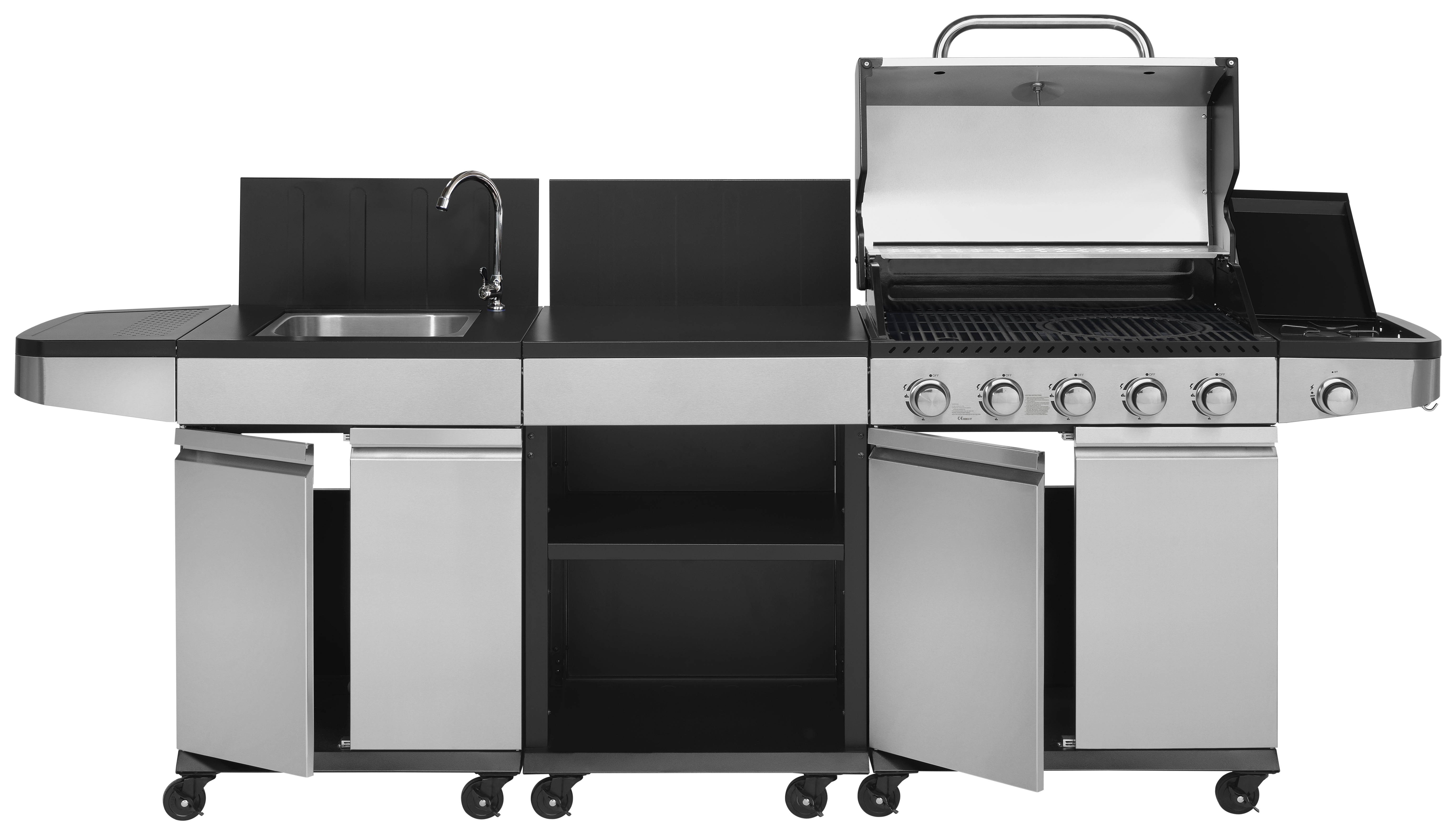 Ausstattung | LED-beleuchtete Bedienknöpfe 3- teiliger Guss- Rost Edelstahl-Warmhalterost Edelstahlspüle mit Armatur Arbeitsfläche Stahl Schwarz beschichtet Doppelwandige Edelstahl-Türen, Korpus Stahl Schwarz Anschlussarmatur Doppelwandige Edelstahl-Haube inkl. Temperaturanzeige 5 Hauptbrenner + 1 Seitenbrenner elektrische Zündung Crossover-Zündung 2 Seitenablagen (eine inklusive Seitenbrenner) |