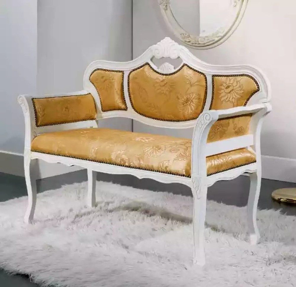 Entdecken Sie die Elegante Polsterbank aus Textil – eine luxuriöse Sitzbank, die Ihrem Wohnraum einen Hauch von Opulenz verleiht. Hergestellt in Europa, steht dieses exquisite Möbelstück für höchste Qualität und erstklassige Verarbeitung. Mit einer Breite von 107 cm und einer Höhe von 95,5 cm bietet die Sitzbank komfortable Platz für zwei Personen. Das ansprechende klassisch-goldene Design, kombiniert mit einem schlichten weißen Gestell, macht sie zum perfekten Highlight in Ihrem Wohnzimmer oder Schlafzimmer. Die Polsterbank überzeugt nicht nur durch ihre ästhetische Erscheinung, sondern auch durch ihre funktionale Ausstattung. Der Bezug aus hochwertigem Textil sorgt für einen luxuriösen Sitzkomfort, während der stabile Holzrahmen Langlebigkeit garantiert. Eine stilvolle Ergänzung für Erwachsene und Jugendliche, die Wert auf Eleganz und Funktionalität legen. Lassen Sie sich von der Eleganz und dem zeitlosen Charme dieser Polsterbank begeistern und verleihen Sie Ihrem Zuhause einen luxuriösen Akzent. Holen Sie sich das Stück, das jedes Ambiente veredelt.