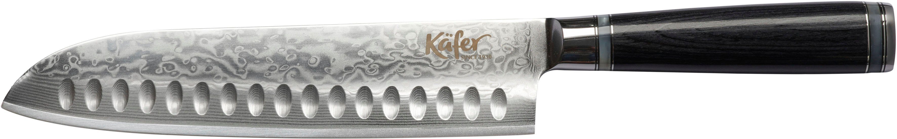 Das Käfer Santoku Messer aus hochwertigem Damaszenerstahl ist ein unverzichtbares Werkzeug für ambitionierte Hobbyköche und professionelle Küchenchefs. Mit einer beeindruckenden Klingenlänge von 205 mm und einem Härtegrad von 60±1 HRC überzeugt das Messer durch außergewöhnliche Schärfe, Flexibilität und lange Haltbarkeit – perfekt für präzises Arbeiten bei Fleisch, Fisch und Gemüse. Gefertigt aus 67-lagigem Damaszenerstahl und von Hand geschliffen sowie poliert, bietet das Messer nicht nur höchste Schneidleistung, sondern auch eine einzigartige Damast-Maserung, die jede Klinge zu einem Unikat macht. Die eisgehärtete Klinge bewahrt ihre Schärfe über lange Zeit und ist gleichzeitig äußerst korrosionsbeständig. Der ergonomische Griff aus edlem Pakkaholz mit Edelstahlabschluss liegt angenehm in der Hand und sorgt für sicheren Halt, auch bei längeren Schneidearbeiten. Das ausgewogene Gewicht und die perfekte Balance ermöglichen ermüdungsfreies Arbeiten und höchste Kontrolle in jeder Bewegung. Durch seine Vielseitigkeit ist das Santoku Messer ein echter Allrounder in der Küche – ob zum feinen Filetieren, Würfeln von Gemüse oder Tranchieren von Fleisch. Es verbindet asiatische Schnittkunst mit europäischer Präzision und bringt damit Funktionalität und Stil auf ein neues Niveau. Ein echtes Premium-Werkzeug für alle, die Wert auf Qualität, Design und Leistung legen. Für optimale Ergebnisse und eine lange Lebensdauer empfehlen wir die Reinigung per Hand.