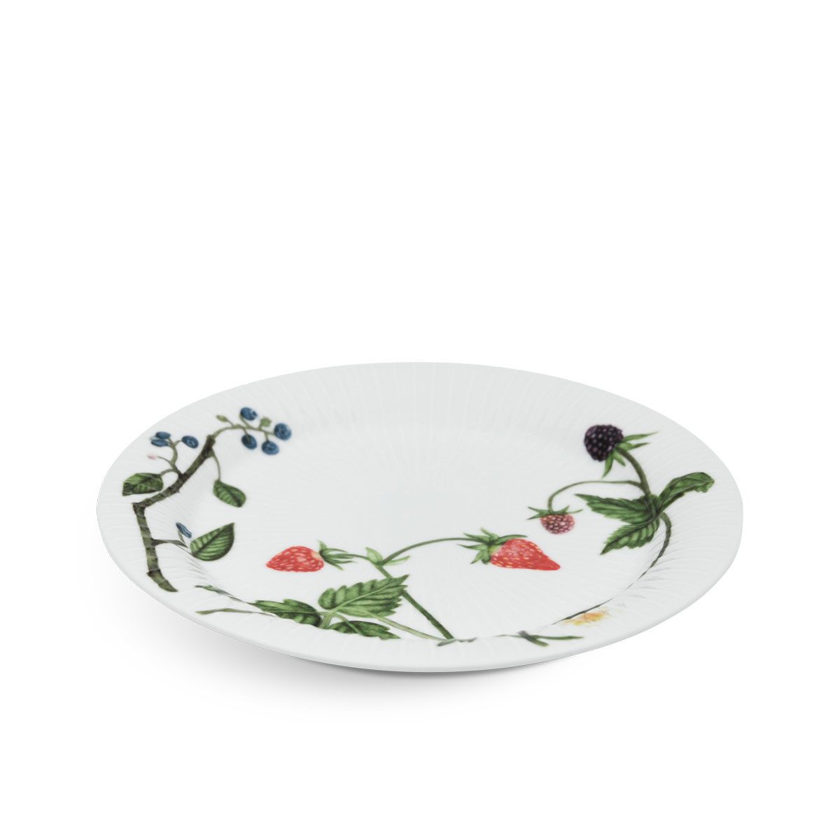 Kähler Design - Hammershøi Summer Teller flach Ø22 cm, summer berries Tauchen Sie mit der Hammershøi Summer Serie von Kähler in die strahlende Wärme des Sommers ein, während Sie Ihren Kaffeetisch auf der Terrasse, dem Balkon oder im Ferienhaus mit delikaten Leckereien dekorieren. Unter den Teilen mit Sommerbeeren befindet sich auch ein Teller mit einem Durchmesser von 22 cm, der mit fröhlichen Motiven wie Erdbeeren, Heidelbeeren und dem spielerischen Tagpfauenauge geschmückt ist, das poetisch durch die sommerliche Landschaft flattert. Dieser Teller ist eine perfekte Ergänzung zu den anderen Stücken der Serie und sorgt für eine fröhliche und einladende Atmosphäre auf Ihrem Tisch, während Sie das authentische, nostalgische Flair der handgefertigten Designtraditionen von Kähler genießen. Stellen Sie sich vor, wie Sie diesen Teller verwenden, um sommerliche Klassiker wie Erdbeerkuchen, frischen Gartensalat oder ein Kartoffelgericht mit Frühkartoffeln und reichlich Schnittlauch zu servieren. Die Motive wurden von der talentierten Künstlerin Rikke Jacobsen auf den bereits bestehenden Teilen des Hammershøi-Services von Hans-Christian Bauer geschaffen. Ihre beeindruckenden Aquarellillustrationen erfassen die reiche Flora und Fauna und fangen die Stimmungen der Natur und der Jahreszeiten um uns herum perfekt ein.