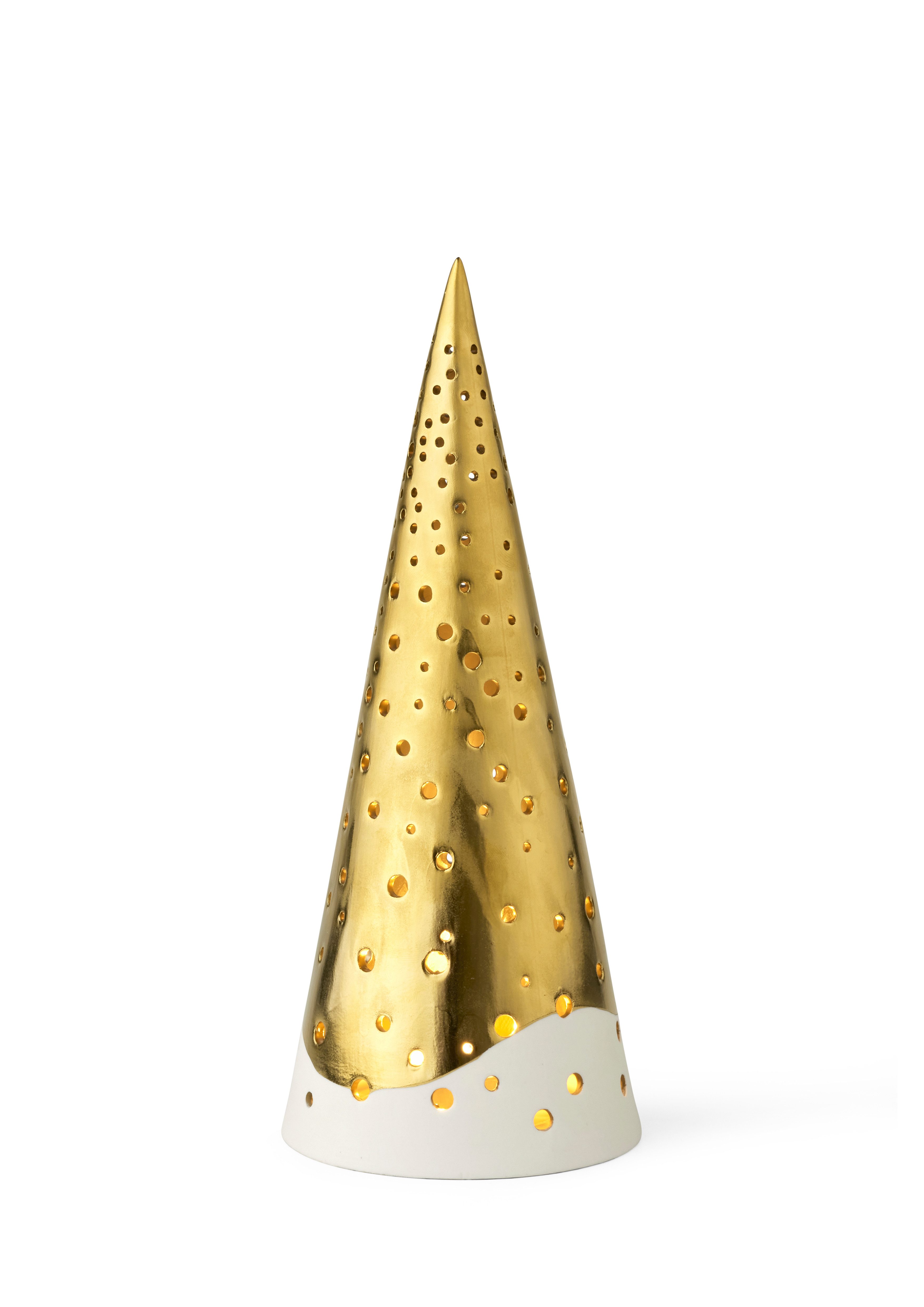 Der Kähler Nobili Teelichthalter vereint klassisches skandinavisches Design mit weihnachtlicher Eleganz. In der neuen mattgoldenen Farbvariante sorgt er für ein warmes, behagliches Lichtambiente. Die kegelförmige Silhouette und die fein gearbeiteten Ausschnitte erzeugen ein faszinierendes Spiel aus Licht und Schatten, das jede Tischdekoration veredelt.