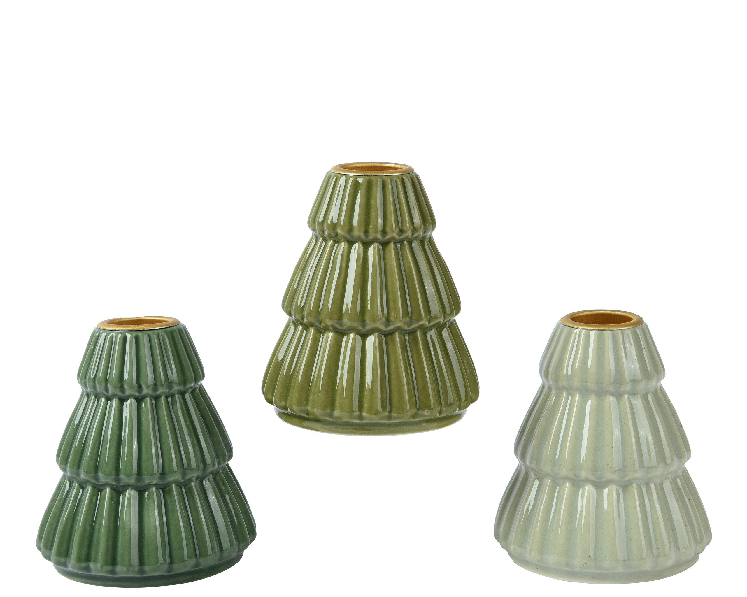 PRODUKT: Kerzenständer in Baumform / INHALT: 1 Kerzenhalter (Auslieferung nach Zufallsprinzip) / MATERIAL: Keramik - Porzellan / GRÖSSE (DxH): ca. 7,5 x 9,5 cm / FARBEN: grün -