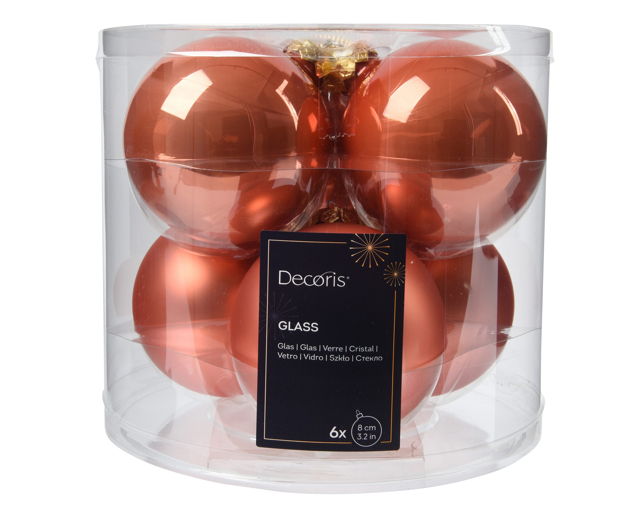 PRODUKT: Große Weihnachtskugeln / DURCHMESSER: ca. 8 cm / MATERIAL: Glas / INHALT: 6 Kugeln / FARBTON: kürbis orange - lachs - pfirsich