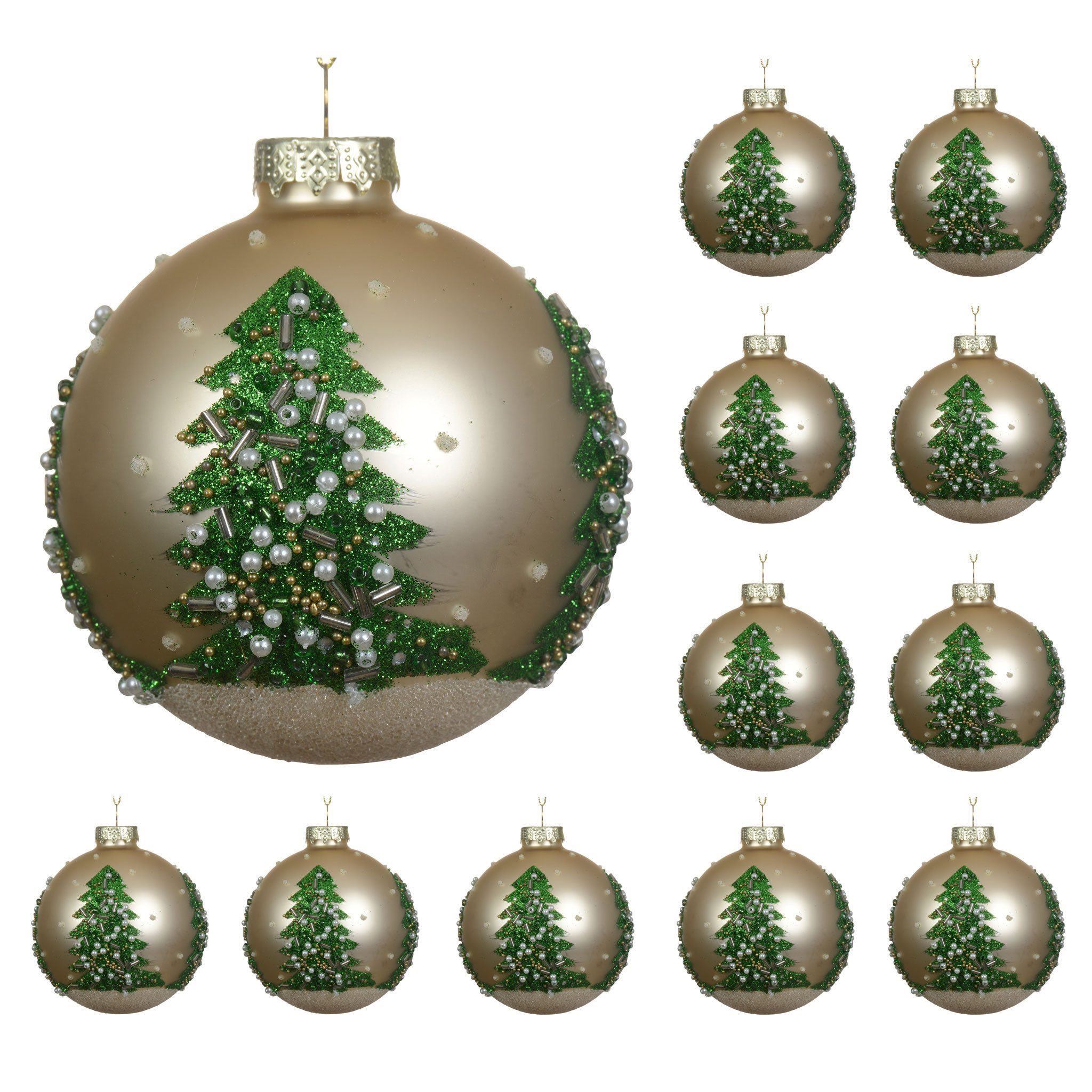 PRODUKT: Weihnachtskugeln mit Tannenbaummotiv / DURCHMESSER: ca. 8 cm / MATERIAL: Glas / INHALT: 12 Kugeln / FARBE: perle, grün
