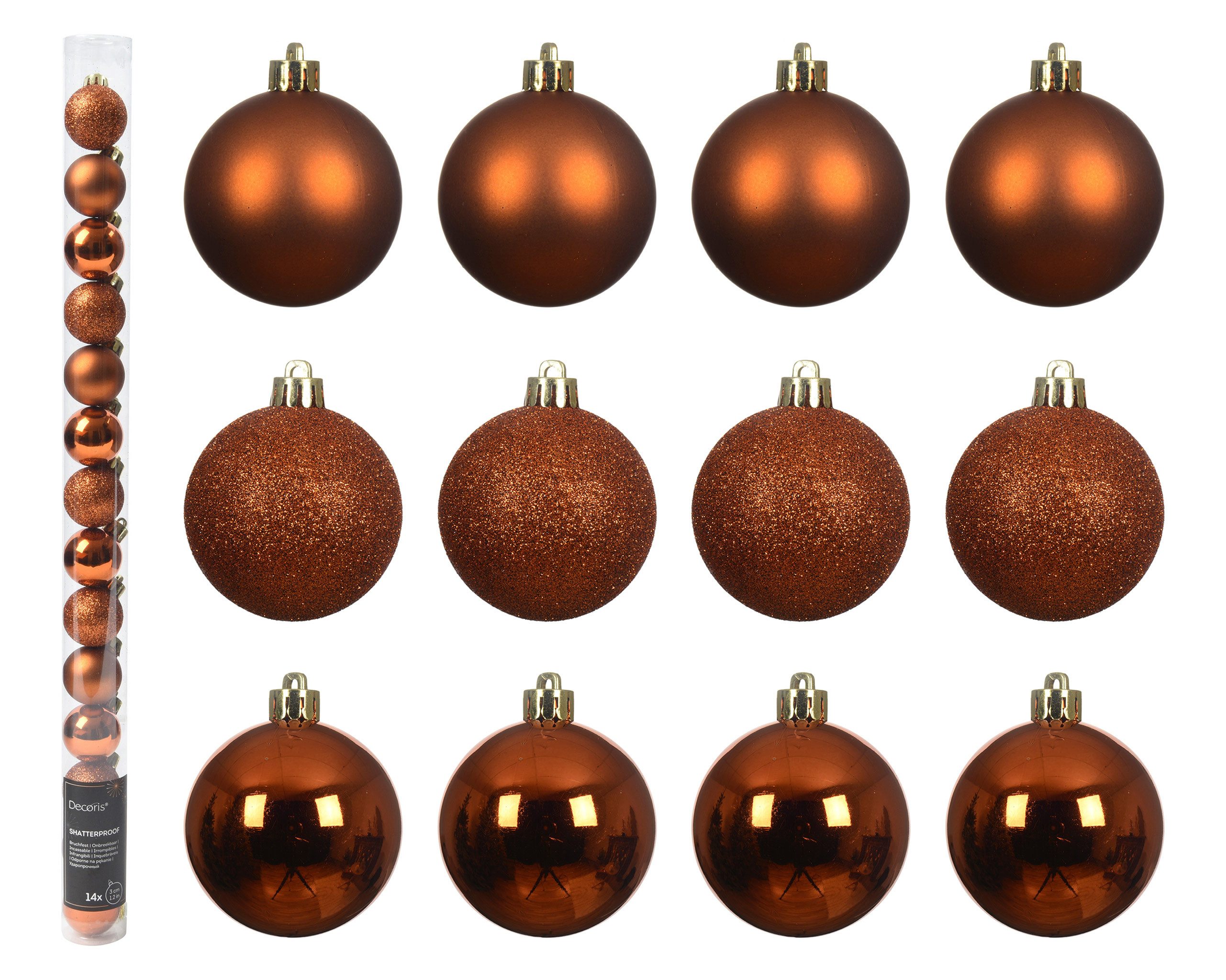 PRODUKT: Kleine Weihnachtskugeln - matt und glänzend gemischt / DURCHMESSER: ca. 3 cm / MATERIAL: Kunststoff - Plastik / INHALT: 14 Kugeln / FARBTON: kupfer - terrakotta -