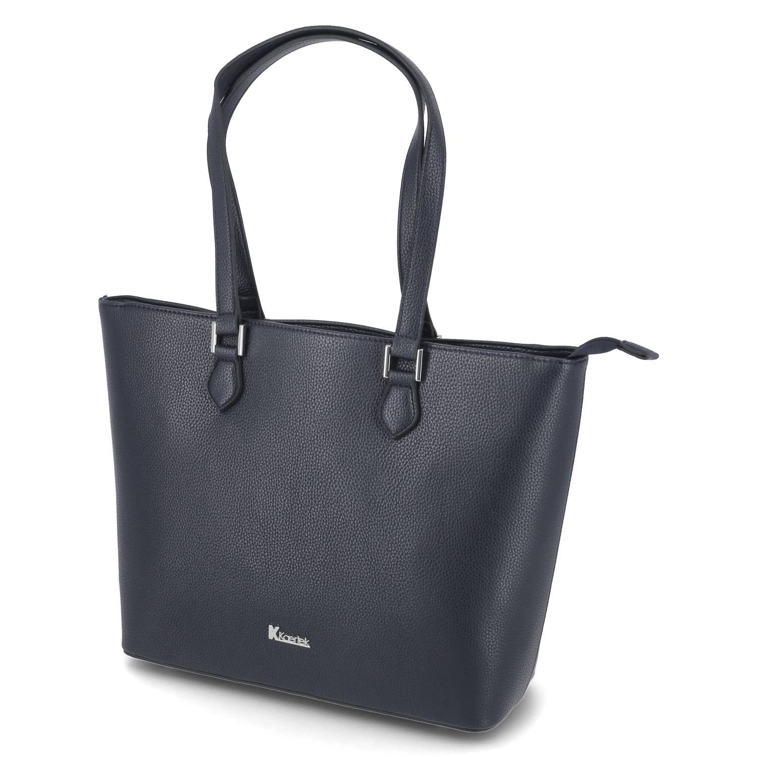 Die Damen Shopper von Kaerlek aus dunkelblauem Kunstleder vereint elegantes Design mit praktischer Funktionalität. Zwei feste Henkel mit einer Длина von ca. 60 cm sorgen für angenehmen Tragekomfort, während das dezente Frontlogo dem Modell eine stilvolle Note verleiht. Der verstärkte Boden mit Metallfüßchen bietet Stabilität und schützt vor Abnutzung. Auf der Rückseite befindet sich ein praktisches Reißverschlussfach für schnellen Zugriff. Das Hauptfach mit Reißverschluss ist geräumig gestaltet und verfügt innen über ein weiteres Reißverschlussfach, ein Schlüsselband mit Karabiner, zwei Steckfächer und zwei Stiftplätze. Mit den Maßen von ca. 28 x 32 x 12 cm (HxBxT) bietet diese Tasche viel Platz für alle wichtigen Utensilien. Ideal kombiniert mit einem Business-Look oder einem eleganten Casual-Outfit, setzt dieser Shopper stilvolle Akzente.