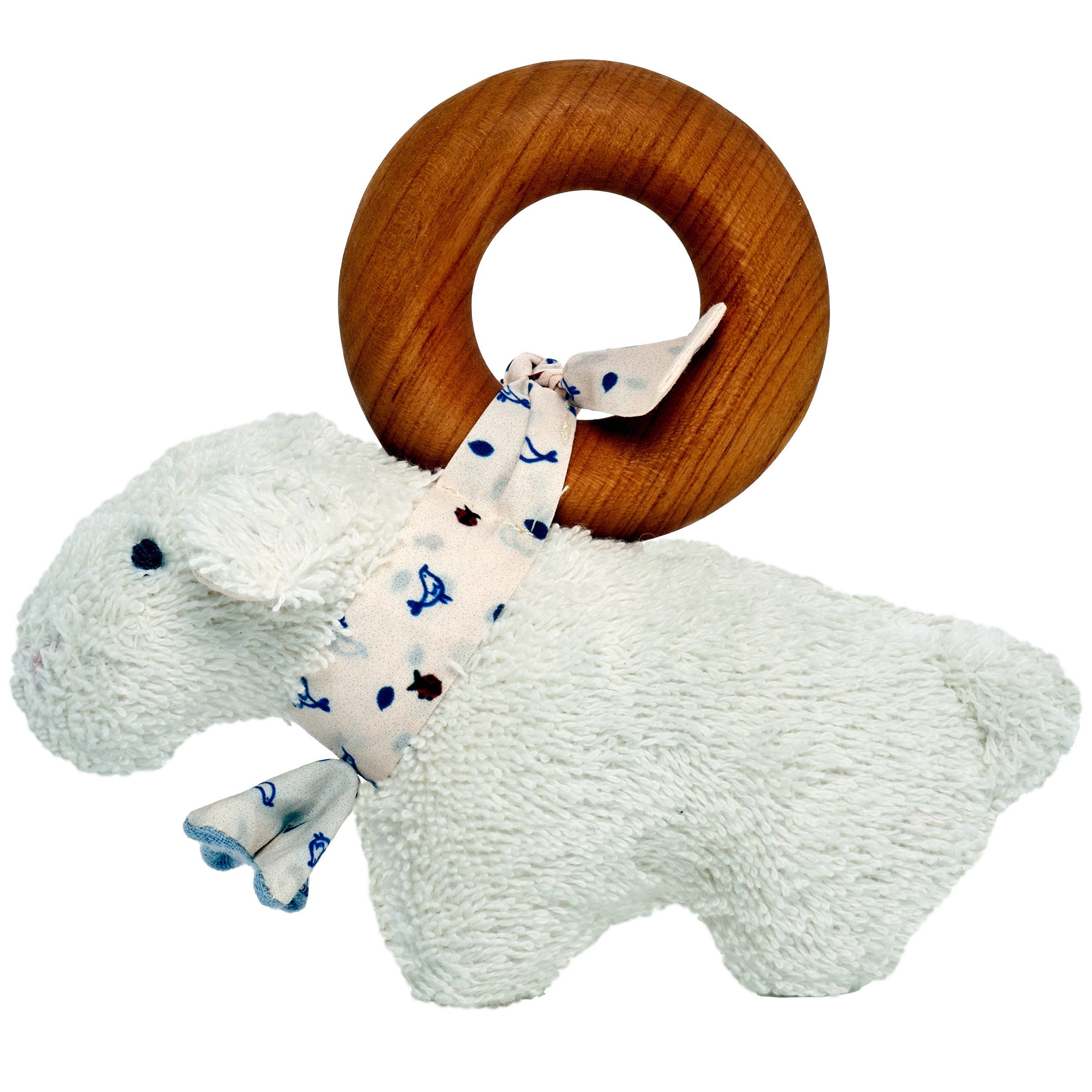 Komm, ich begleite dich: Das kleine Lämmchen ist Kuschelfreund und Rassel in einem. Es ist an einem Kirschbaumholzring fest geknotet, kann aber auch abgenommen und als Rassel bespielt werden. Schöner Blickfang: Das niedliche Bauernhof-Design des weichen Glockenhalsbands, welches das Lämmchen trägt und als Befestigung am Greifling dient. Das kleine Bauernhoftier ist ein echter Freund, das schon vom allerkleinsten Fingerchen betastet werden kann.