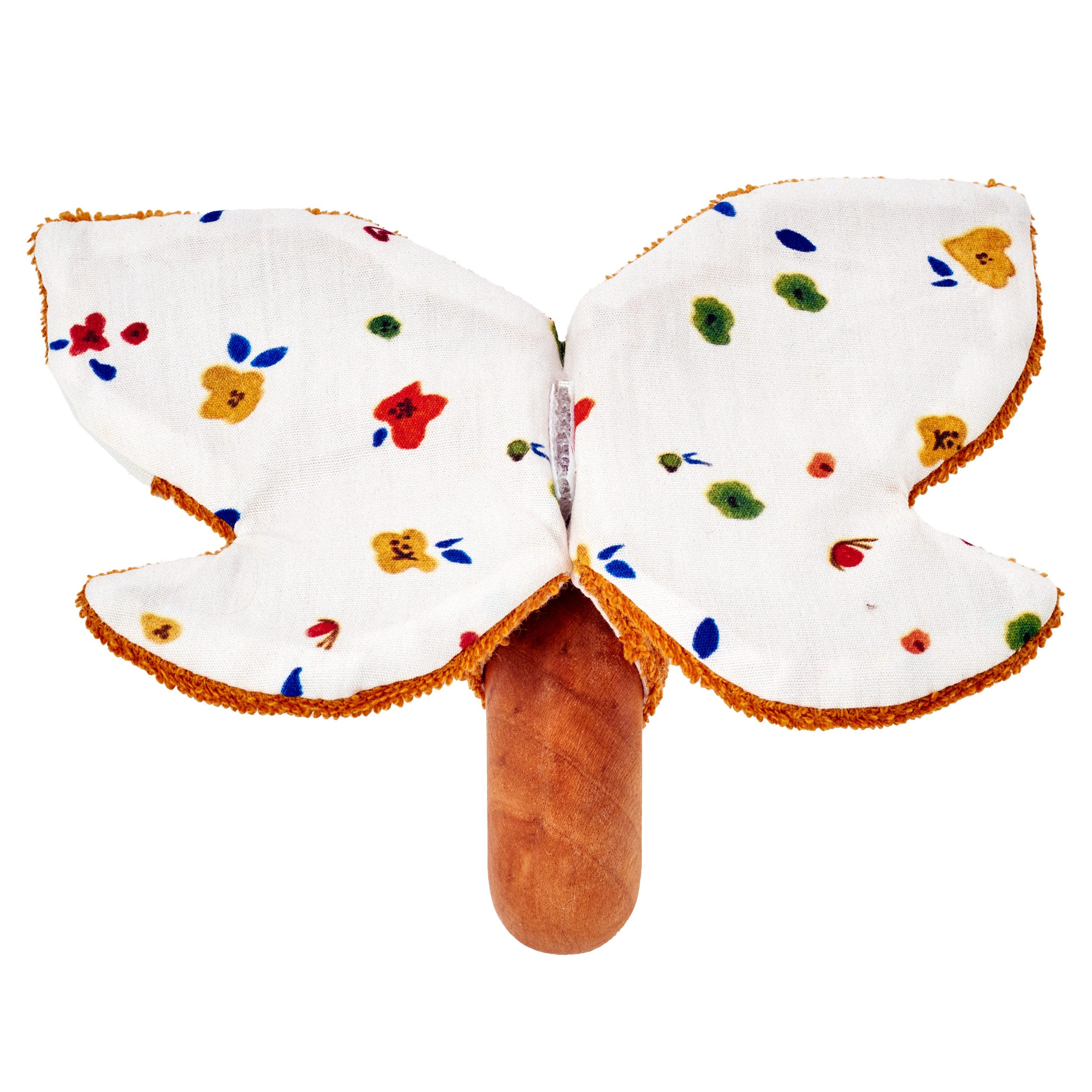 Was raschelt denn da? Den wunderschönen Greifling aus Kirschbaumholz ziert ein niedlicher Schmetterling aus Strickfrottee, gedoppelt mit original Käthe Kruse Print. Dieser ist mit Knisterfolie gefüllt und lädt kleine Händchen zum Entdecken und Lauschen ein. Babys ab 3 Monate können Greiflinge meist gut greifen und ertasten, insbesondere wenn sie aus verschiedenen Materialien bestehen.