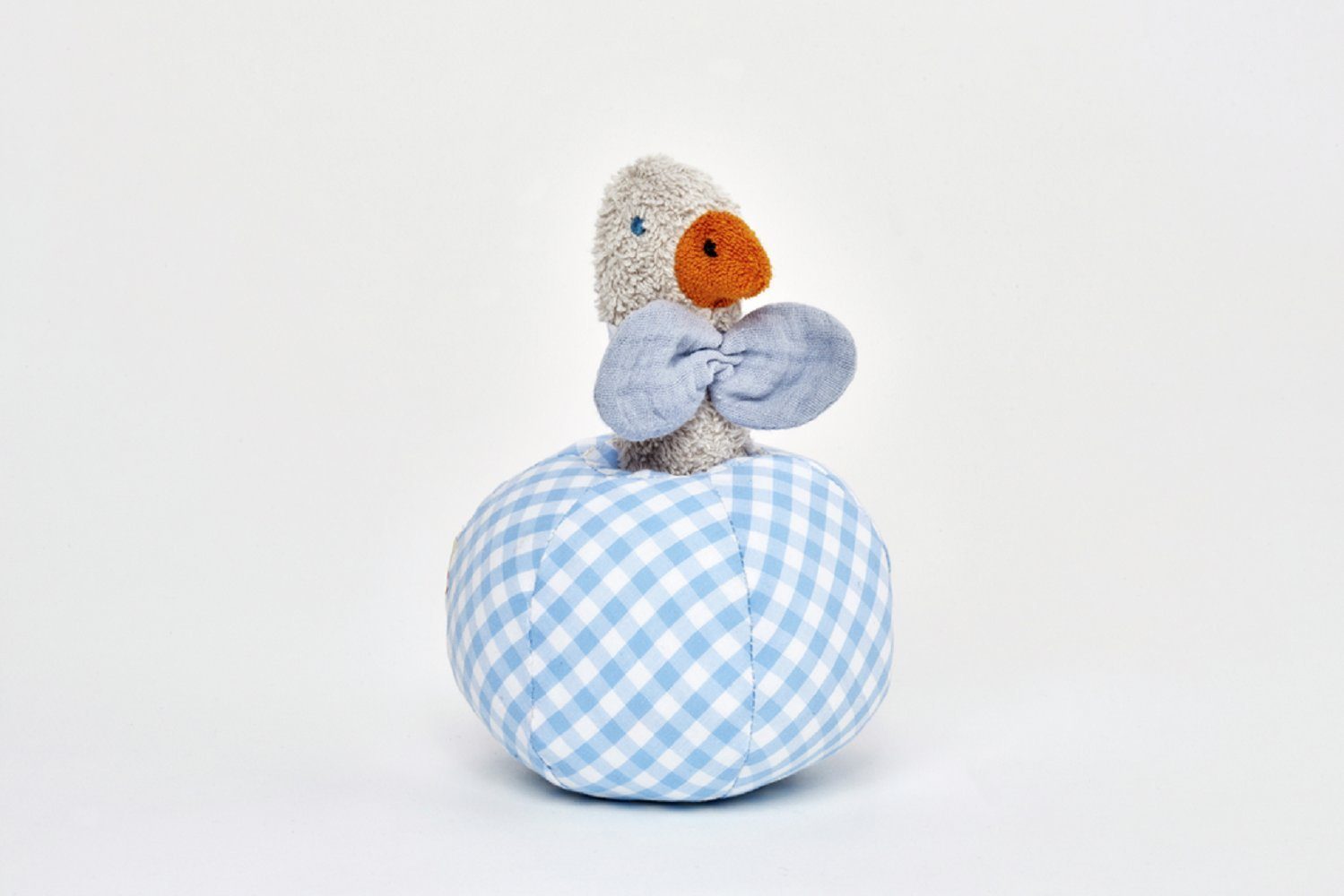 Ebba Ente Rassel + Ball super weich Material: Musselin/ Pico: 100 % Baumwolle Polyester Baumwolle Wer hat Ebba gesehen? Die kleine Ente versteckt sich in einem weichen Ball aus karierter Baumwolle und dient als niedlicher Greifling. Kleine Fingerchen können sie aus dem Ball fischen oder wieder darin verschwinden lassen – perfekt für erste Steckspiele. Ebba ist aus Frottee und verfügt über eine niedliche Musselinschleife. Ihr Schnabel ist aus Baumwollstrickfrottee. Wird Ebba hochgenommen und bewegt, überrascht sie mit einem sanften Rasseln