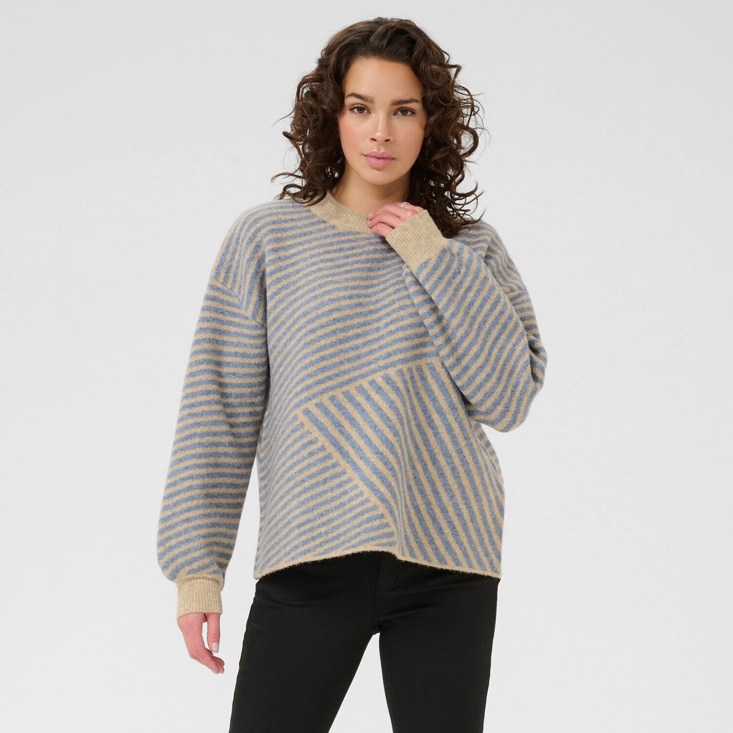 Mit dem KAverana Knit Damen Pullover von Kaffe, liegst du in diesem Herbst und Winter voll im Trend. Er fällt durch sein plakatives Streifenmuster in Grau mit Schwarz sofort ins Auge. Er ist mit einem kleinen Stehkragen mit Rippstrick gearbeitet und hat lange Ärmel. Die lockere Passform macht ihn besonders komfortabel.
