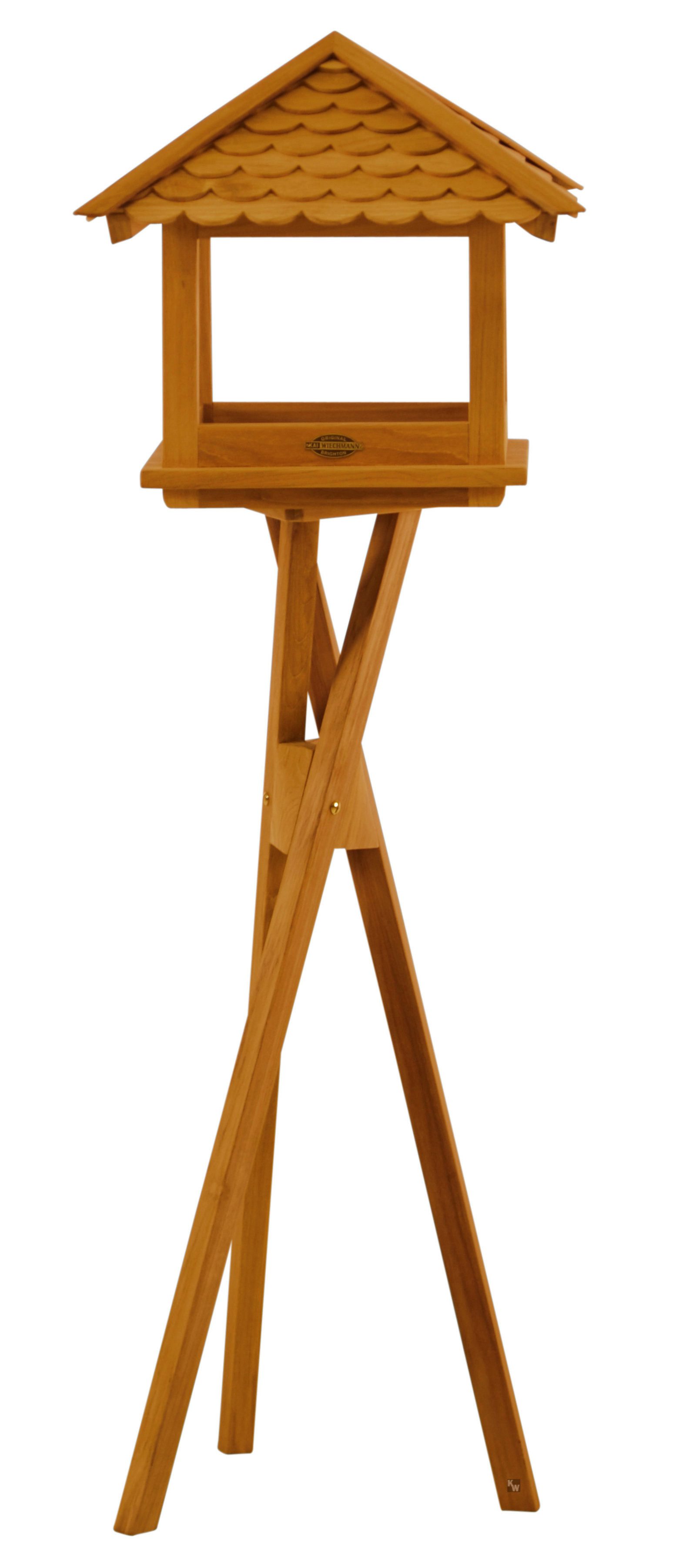 Unser Vogelfutterhaus überzeugt durch sein massives, hochwertig verarbeitetes Teakholz aus nachhaltigem Plantagenanbau, das mindestens 50 Jahre langsam gewachsen ist. Es besticht durch außergewöhnliche Stabilität, elegante Optik und Wetterfestigkeit. Das sorgfältig gearbeitete Zeltdach mit Holzschindeln schützt Futter und Vögel vor Regen und Schnee, während das offene Design freie Sicht auf die Tiere ermöglicht. Zwei herausnehmbare Leisten der Überwurfkante sorgen für leichtes Saubermachen. Ein robuster Dreifußständer sorgt für Stabilität und macht das Vogelhaus überall aufstellbar.
