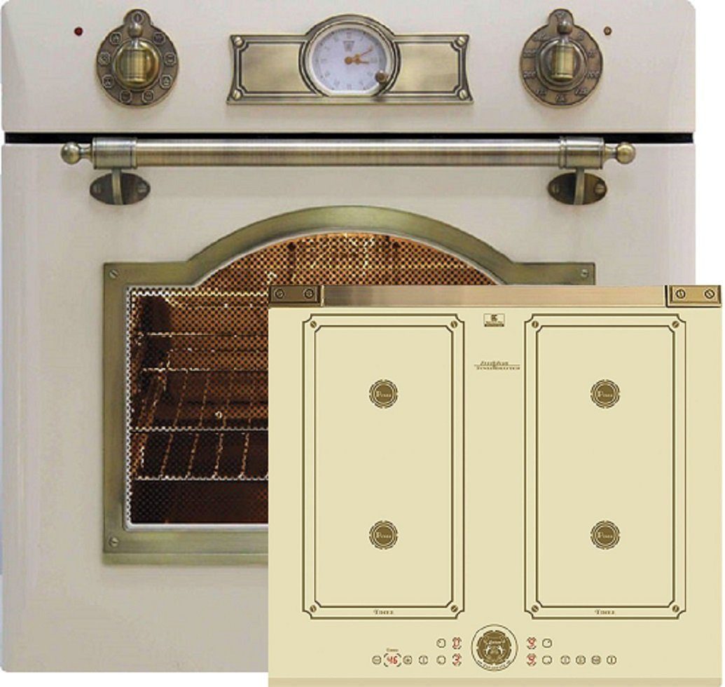 Die flachen einteiligen Kochfelder mit leicht abgeschrägten Kanten und einer Facette vorne verfügen über ein elegantes Design mit zahlreichen Art Déco Dekorelementen wie die Beschläge aus massivem Metall der Antik-Goldtönen, das Ihrer Küche einen exklusiven Stil verleiht.