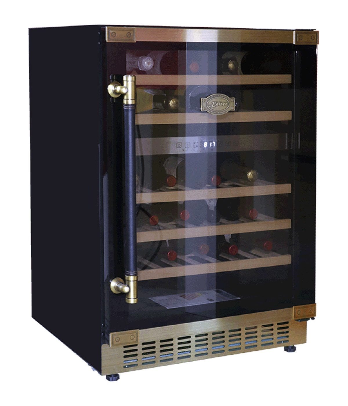 Top-Features | Glas Farbe Anthrazit / Dekor – massives Metall Antique Gold Elektronische fullTouch-Bedienung Dual Zone mit LED-Display LED-Beleuchtung Inhalt: 46 Weinflaschen 2 Klimazonen: Weiß- und Rotwein 5 herausziehbare Holzregale |