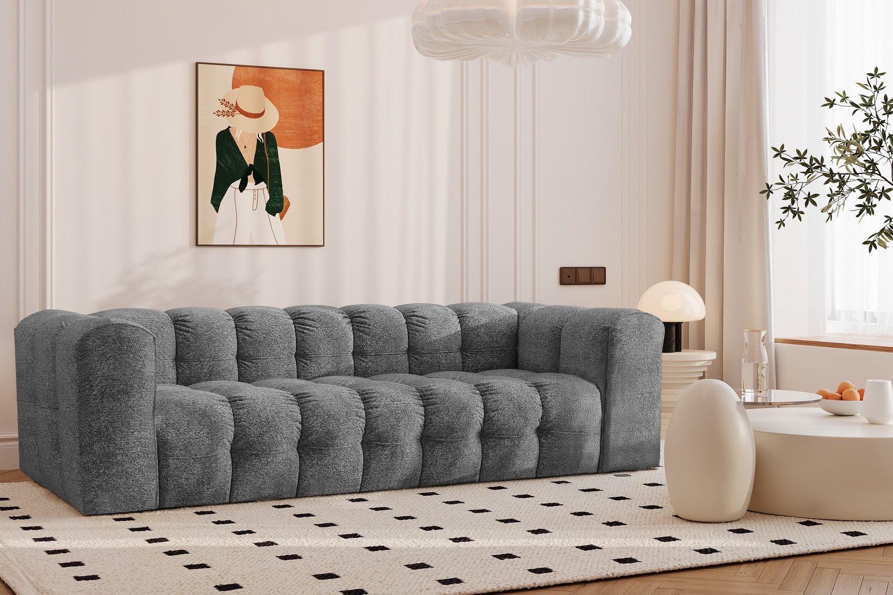 Die Sofa BALOO 4-Sitzer verbindet modernes Design mit höchstem Sitzkomfort. Mit ihrer großzügigen Form und den markanten Steppungen wird sie schnell zum Mittelpunkt jedes Wohnzimmers. Die tiefe Sitzfläche lädt zum Entspannen ein und bietet ausreichend Platz für Familie und Gäste. Dank der stabilen Konstruktion mit HR-Schaumstoff T31 und Wellenfedern Typ A ist die Couch besonders langlebig und behält auch bei täglicher Nutzung ihre Form. Als freistehende Sofa lässt sich das Modell flexibel im Raum platzieren – ideal für moderne Wohnkonzepte.