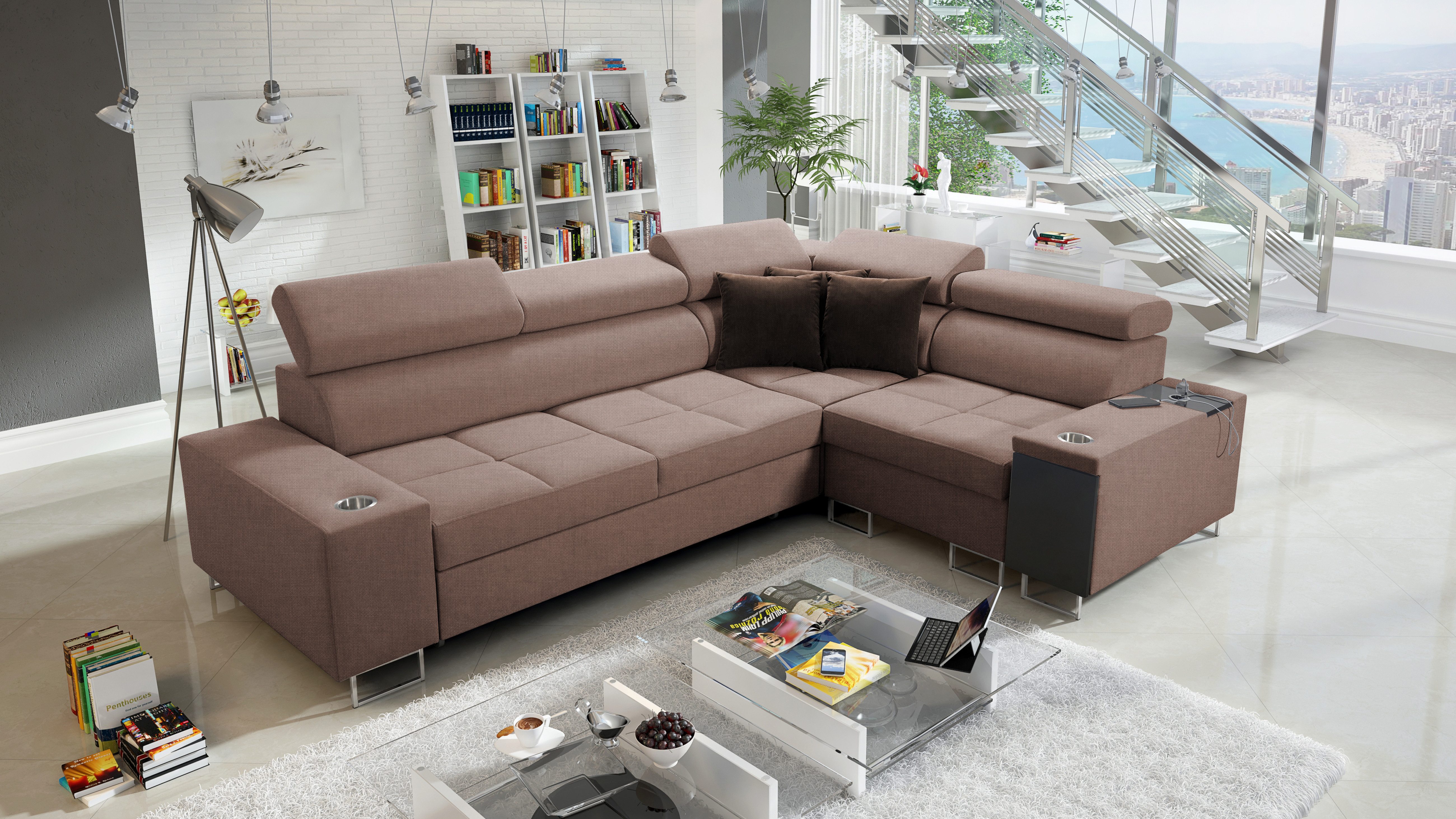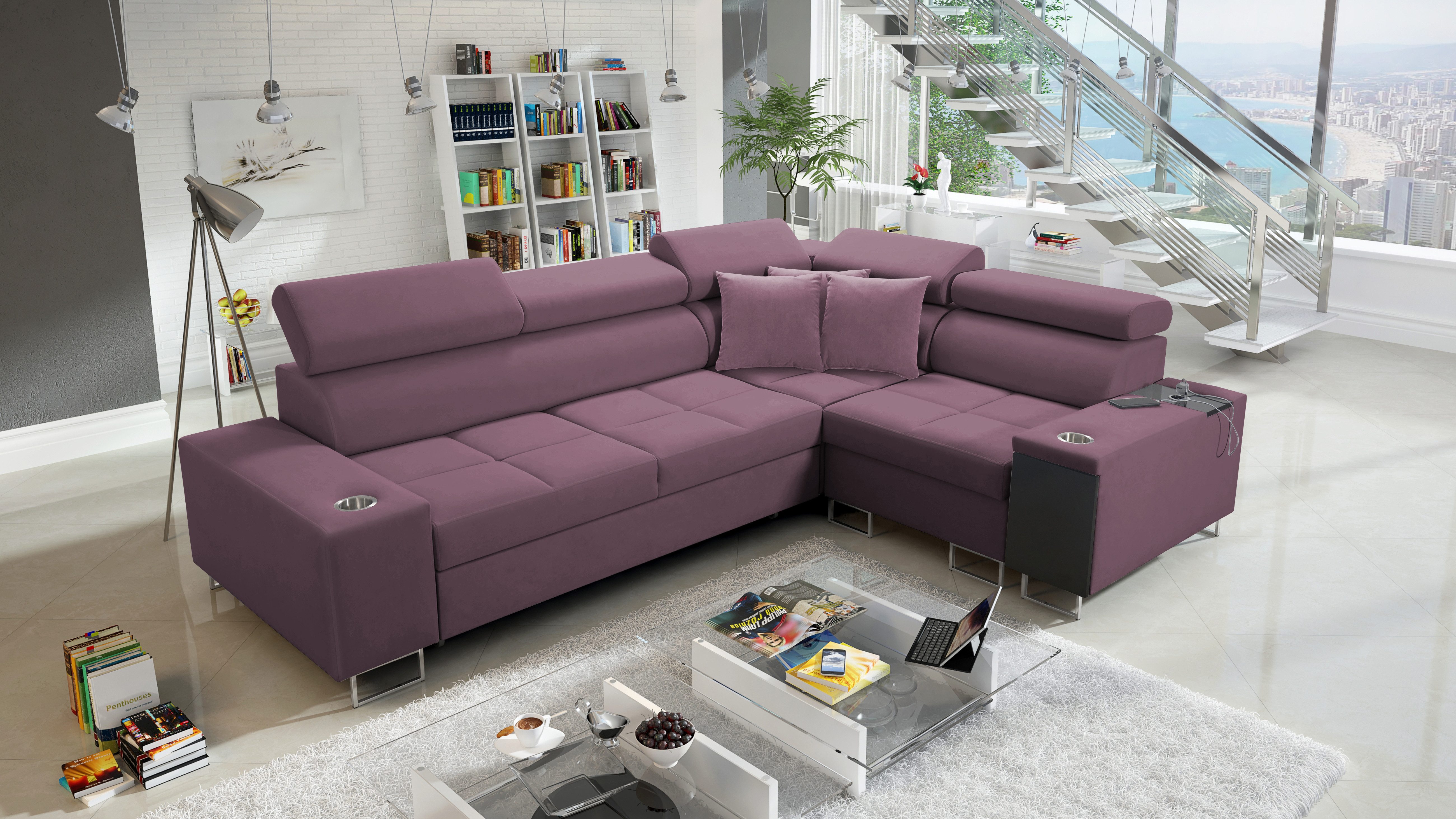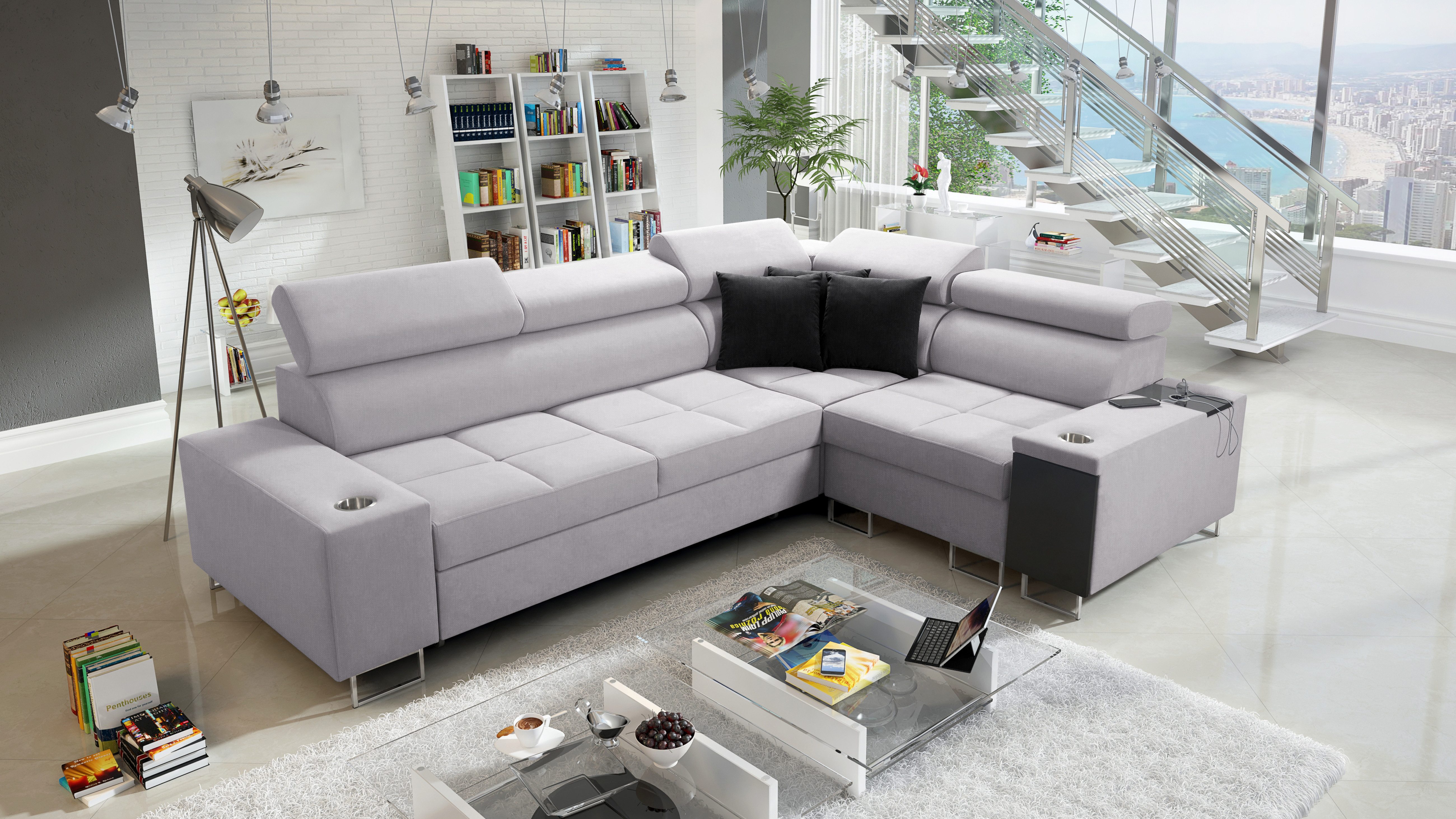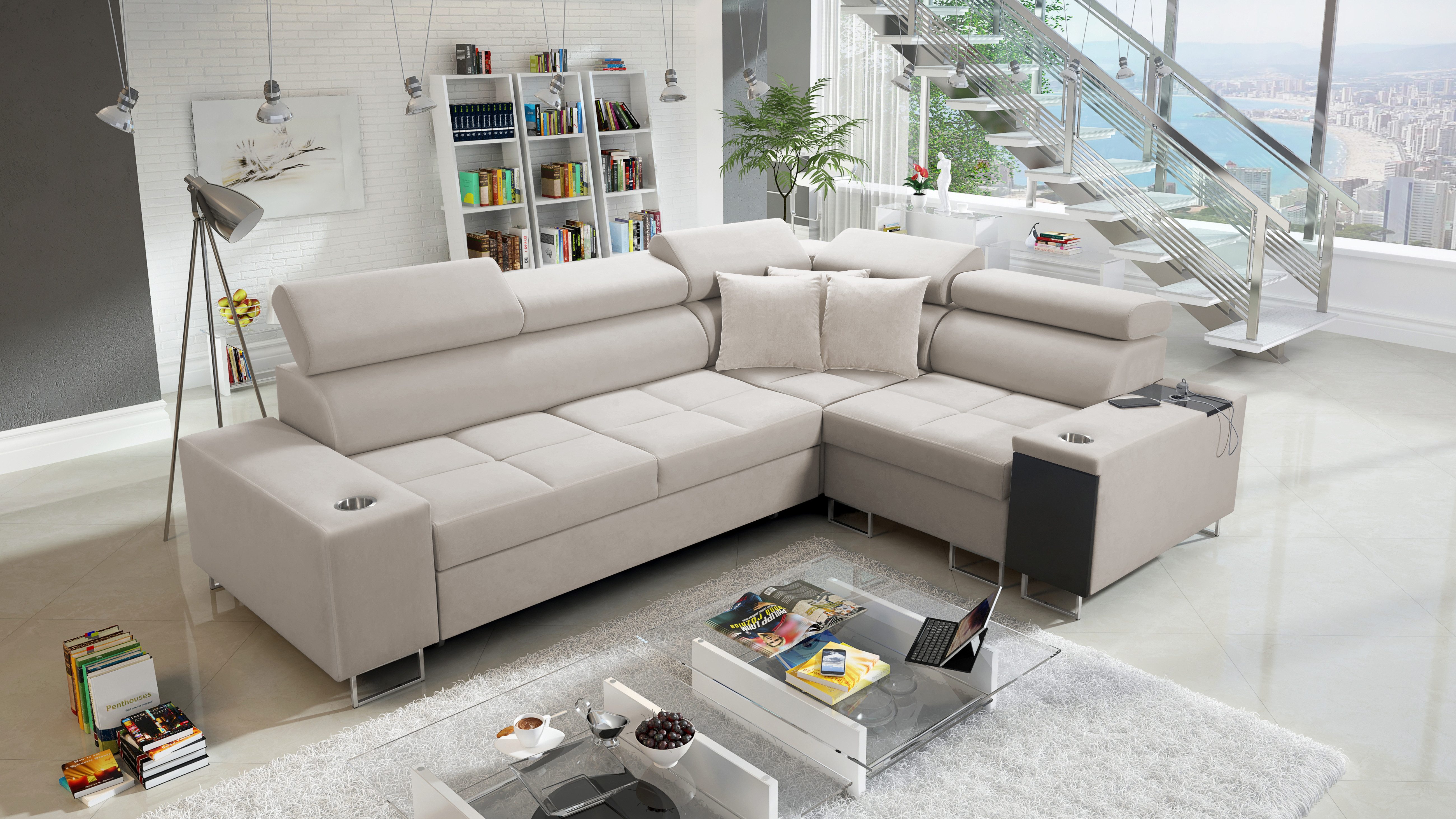 Das Modell MORENA II wird auch die anspruchsvollsten Kunden begeistern. Dieses Ecksofa wurde aus einer Leidenschaft für Eleganz und Modernität heraus entwickelt. Das klassische L-förmige Layout wird mit modernen Elementen kombiniert, die den Nutzungskomfort beeinflussen. Sorgfältig ausgewählte Polstermaterialien und eine solide Füllung der Sitzfläche - gewellte Federn in Kombination mit HR35-Schaumstoff - sorgen für eine außergewöhnliche Weichheit und Polsterung, die den Körper beim Entspannen gut stützt. Die solide Konstruktion des Holzrahmens mit einer Spanplattenkombination gewährleistet eine lange Lebensdauer. Das Ecksofa ist in einer Vielzahl von Stoffen und vielen Farbpaletten erhältlich. Ein zusätzlicher Vorteil des Ecksofas mit Bar ist die integrierte Steckdose und der USB-Eingang, so dass Sie Ihr Handy oder Ihren Computer auf dem Schoß haben und gleichzeitig aufladen können.