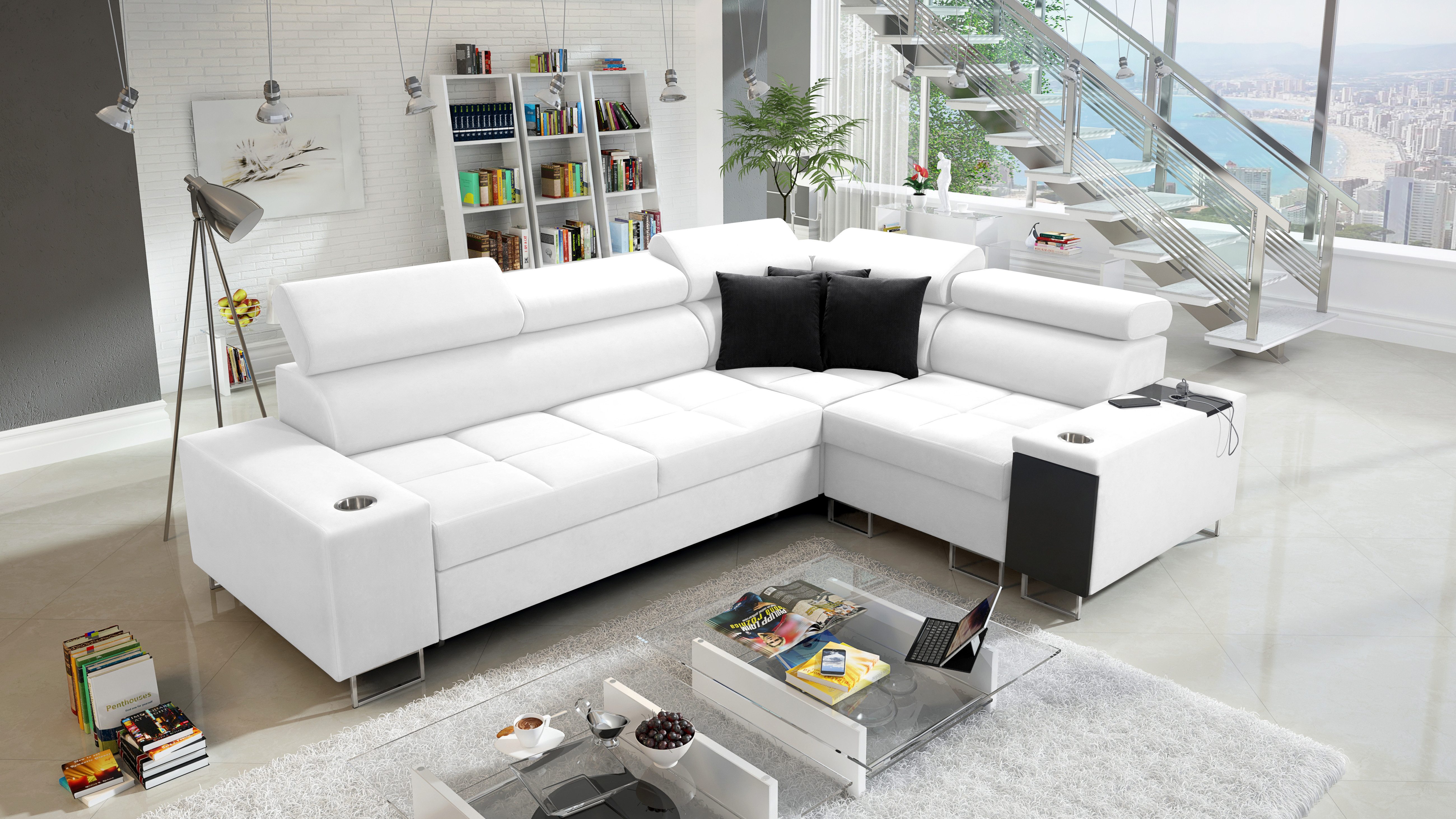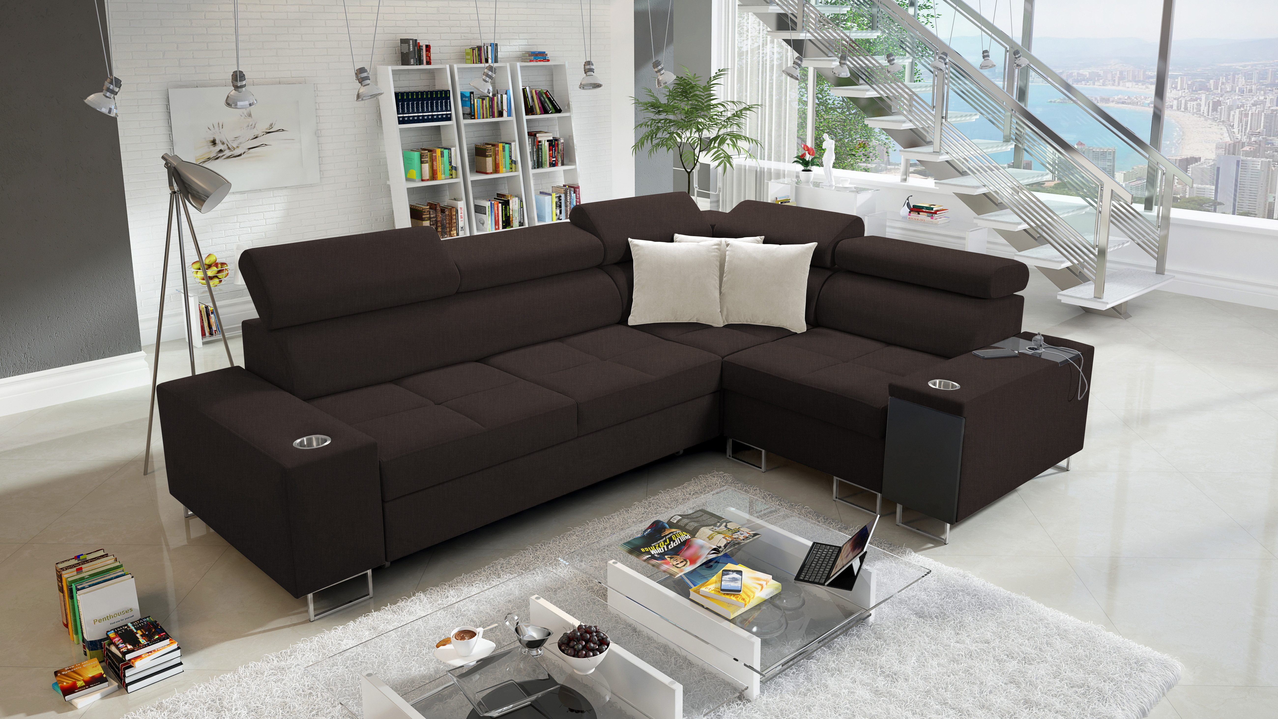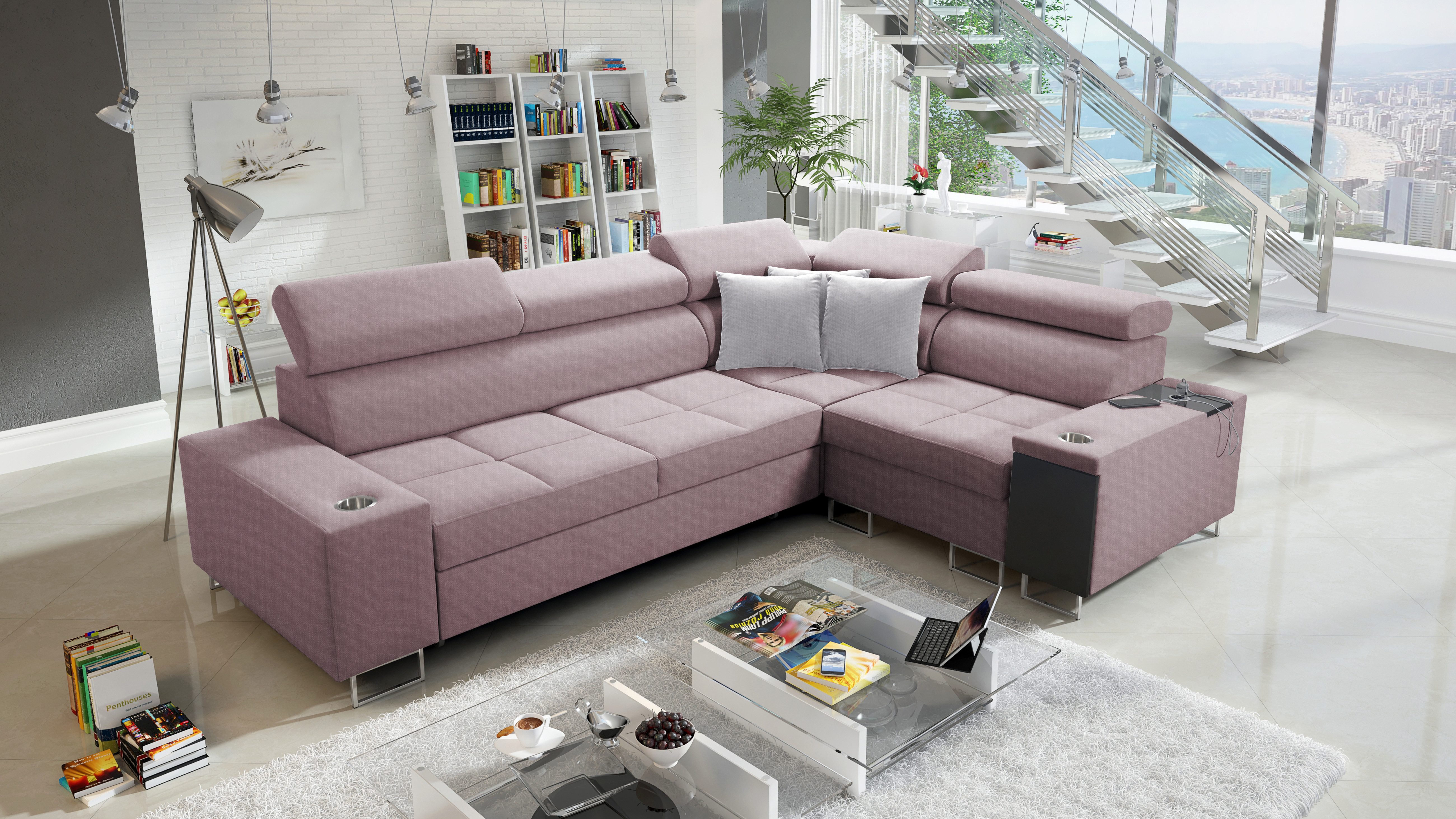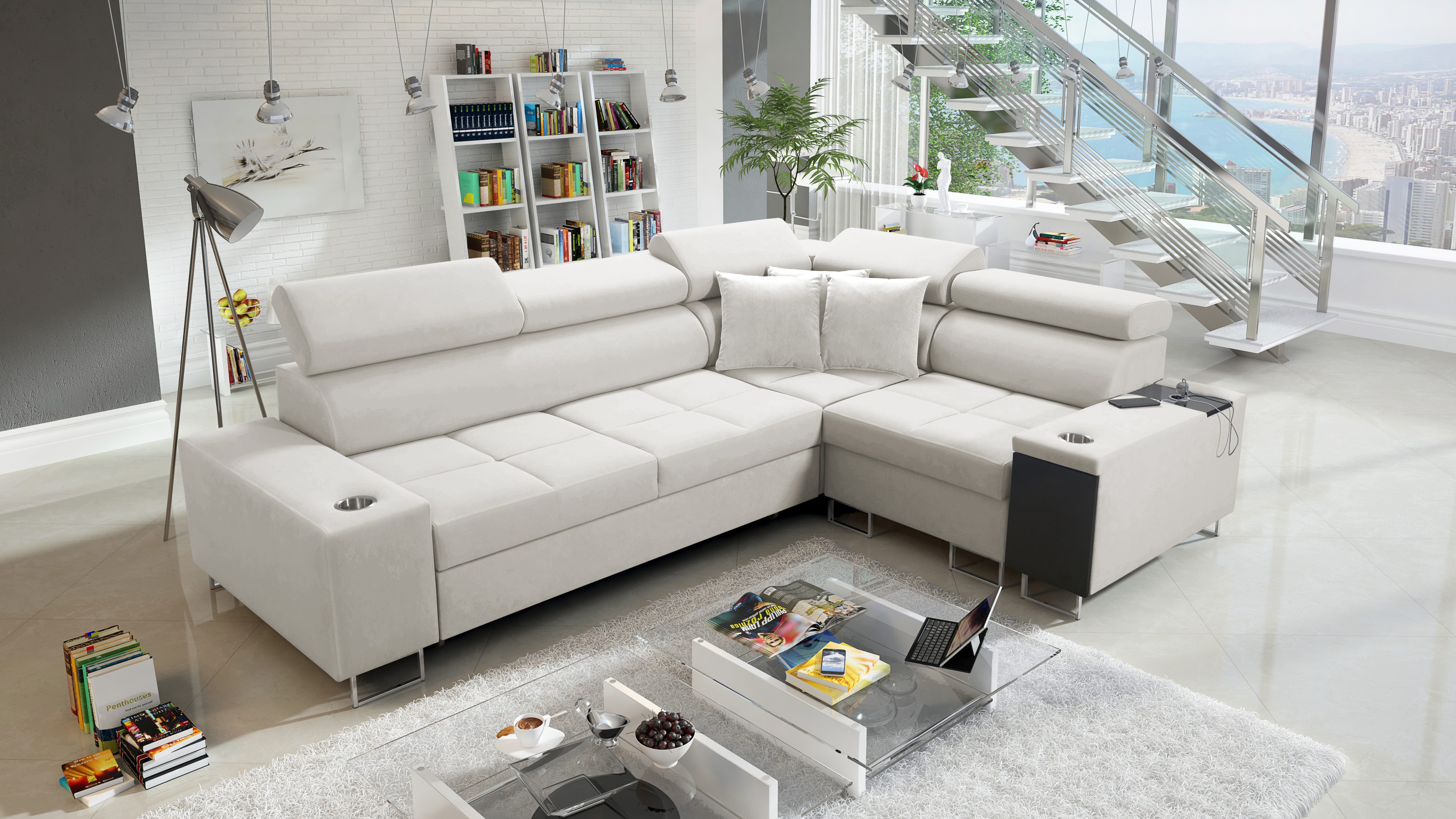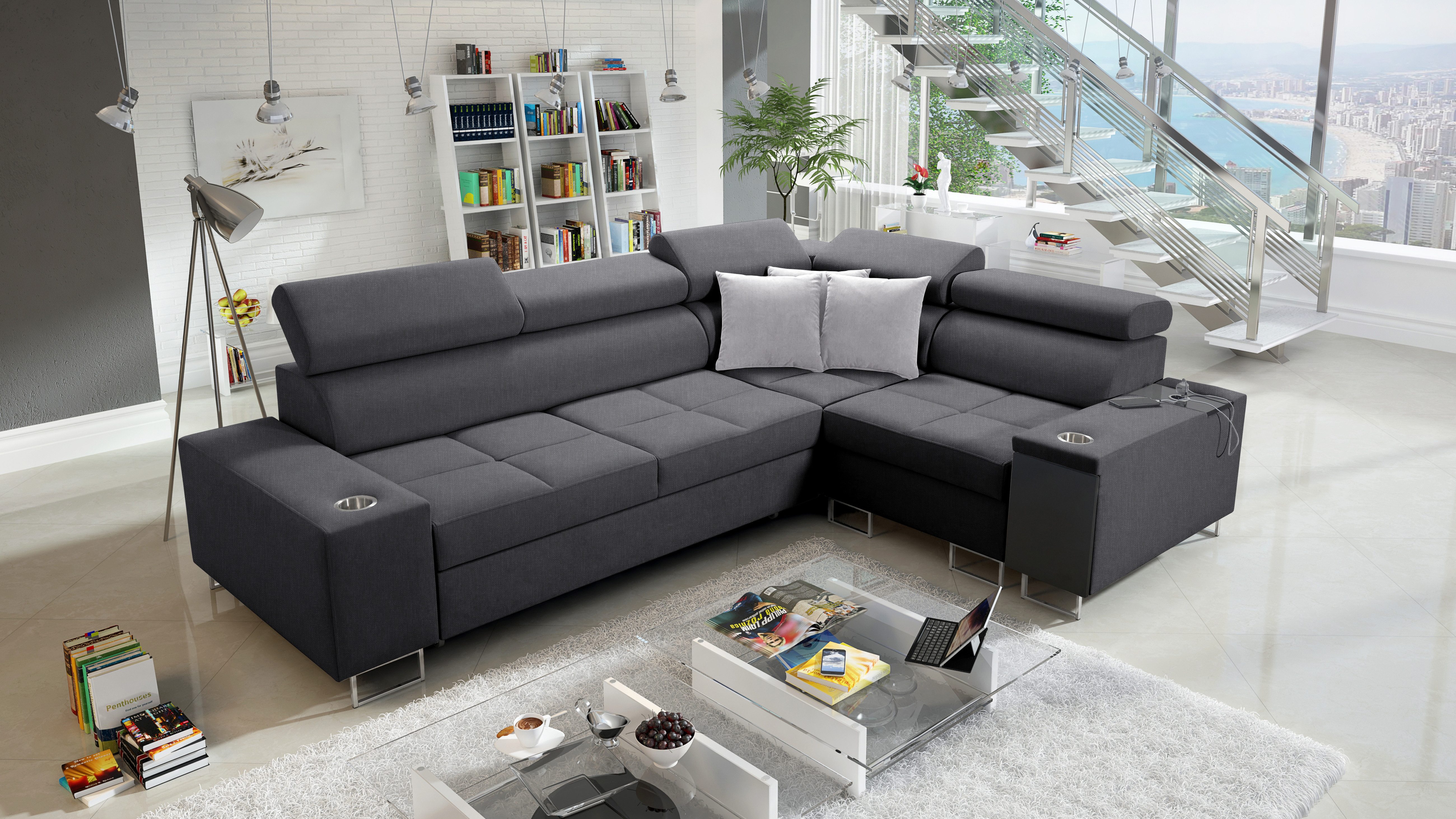 Das Modell MORENA II wird auch die anspruchsvollsten Kunden begeistern. Dieses Ecksofa wurde aus einer Leidenschaft für Eleganz und Modernität heraus entwickelt. Das klassische L-förmige Layout wird mit modernen Elementen kombiniert, die den Nutzungskomfort beeinflussen. Sorgfältig ausgewählte Polstermaterialien und eine solide Füllung der Sitzfläche - gewellte Federn in Kombination mit HR35-Schaumstoff - sorgen für eine außergewöhnliche Weichheit und Polsterung, die den Körper beim Entspannen gut stützt. Die solide Konstruktion des Holzrahmens mit einer Spanplattenkombination gewährleistet eine lange Lebensdauer. Das Ecksofa ist in einer Vielzahl von Stoffen und vielen Farbpaletten erhältlich. Ein zusätzlicher Vorteil des Ecksofas mit Bar ist die integrierte Steckdose und der USB-Eingang, so dass Sie Ihr Handy oder Ihren Computer auf dem Schoß haben und gleichzeitig aufladen können.