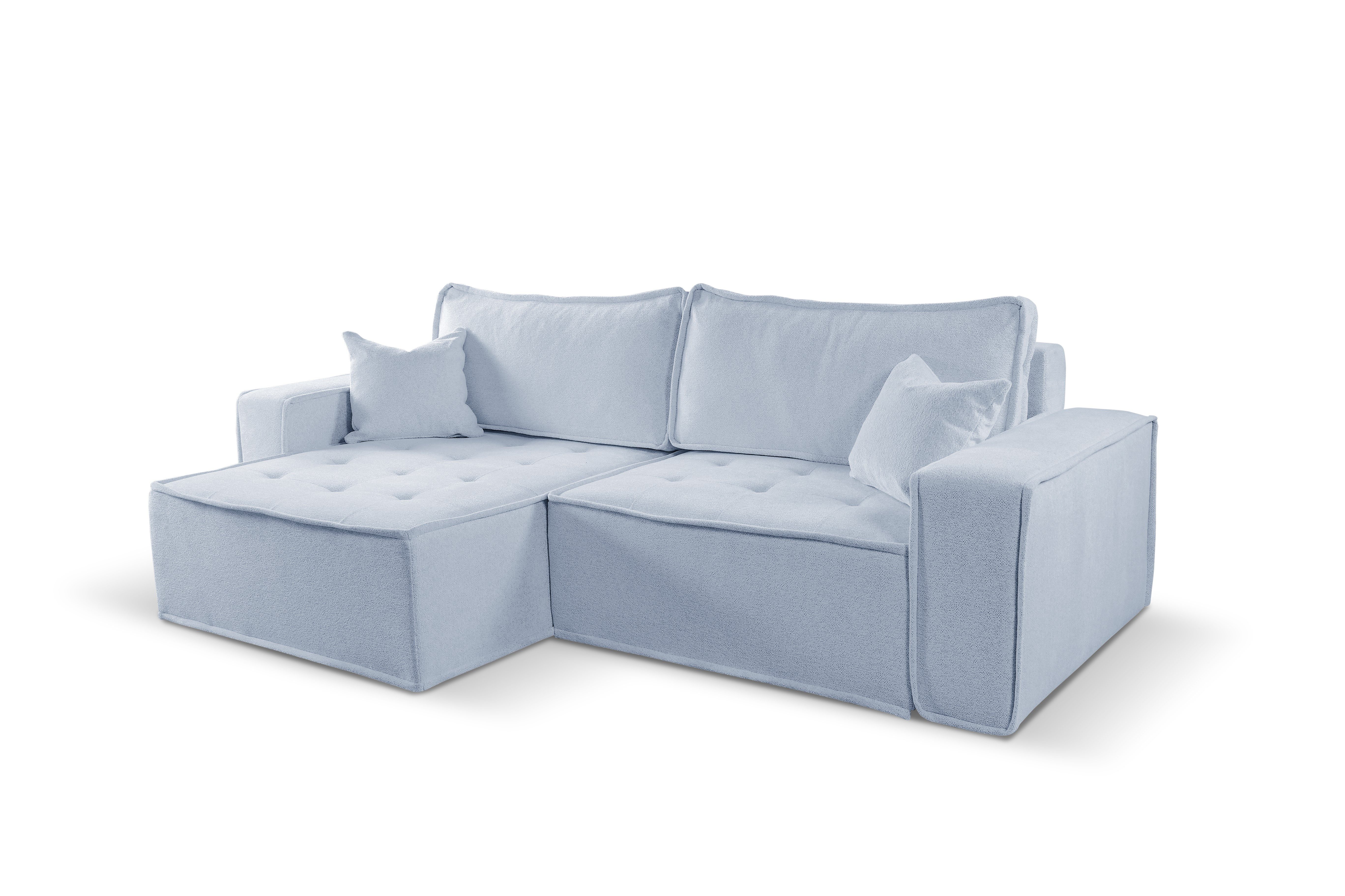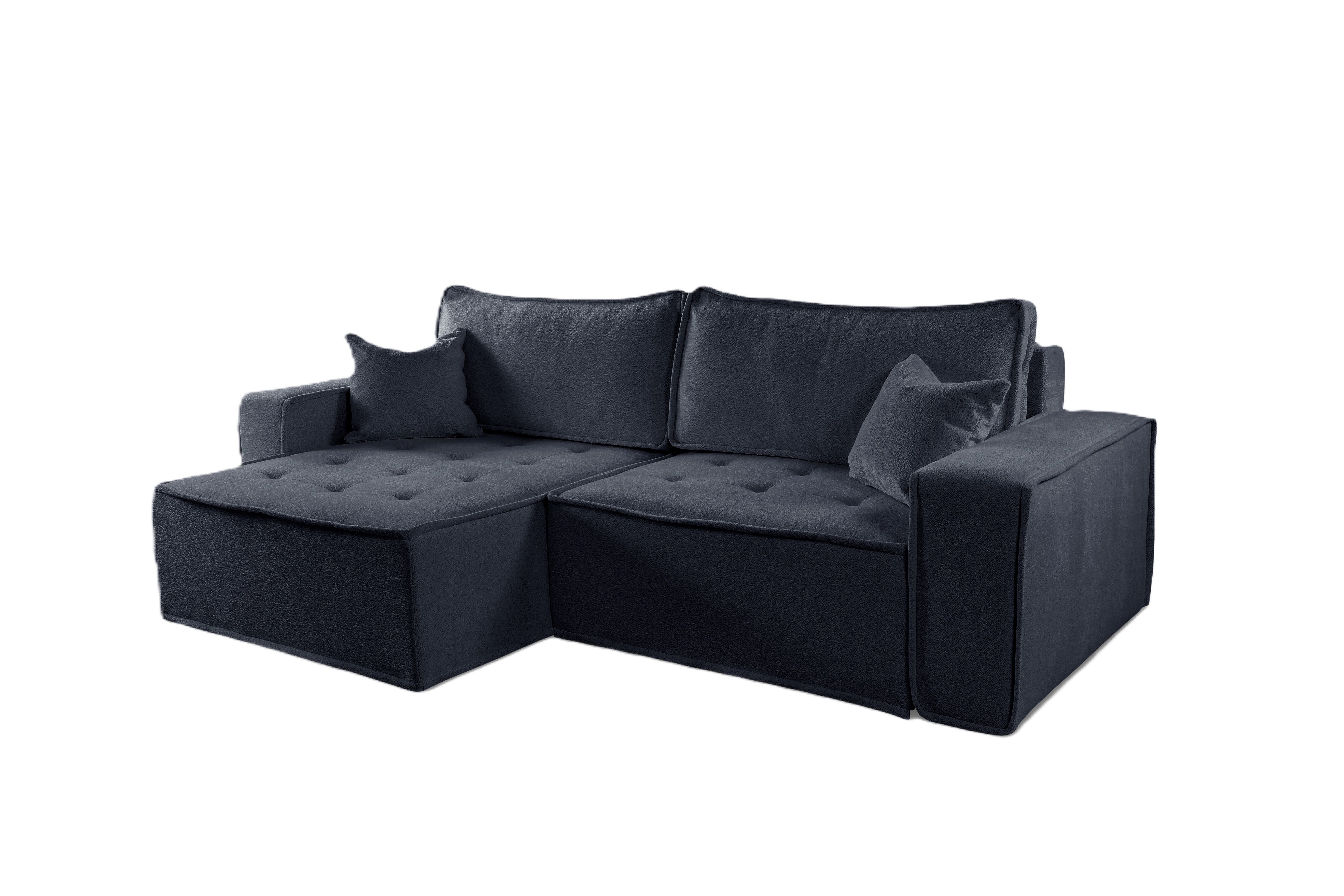 Ein Ecksofa mit gesteppter Sitzfläche, rundum mit Paspelierung, in modernem Stil und aus hochwertigen Materialien gefertigt. Auf den Bildern sehen Sie das Möbelstück in dem sehr angenehmen Stoff Raven, der ihm einen Hauch von Glamour und Eleganz verleiht, während die Paspel noch mehr Klasse verleiht. Der Komfort des Ecksofas wird durch die Verwendung von gewellten Federn und hochwertigem HR-Schaum gewährleistet, dank derer es sich perfekt an den Körper anpasst. Zusätzliche Unterstützung für die Wirbelsäule bieten Kissen mit Silikonkugeln, die antiallergische Eigenschaften haben, und Schaumstoffgranulat, das resistent gegen Verformungen ist. Ein weiterer Vorteil ist die praktische Schlaffunktion mit DL-Mechanismus, mit der Sie das Sofa leicht ausklappen und schnell in ein bequemes Bett verwandeln können. Ein Vorteil unseres kleinen Ecksofas ist, dass es über einen Bettzeugbehälter verfügt, so dass Sie sich keine Gedanken darüber machen müssen, wo Sie zusätzliches Bettzeug unterbringen können. Das Ecksofa ist vielseitig einsetzbar - es kann sowohl auf der linken als auch auf der rechten Seite stehen.