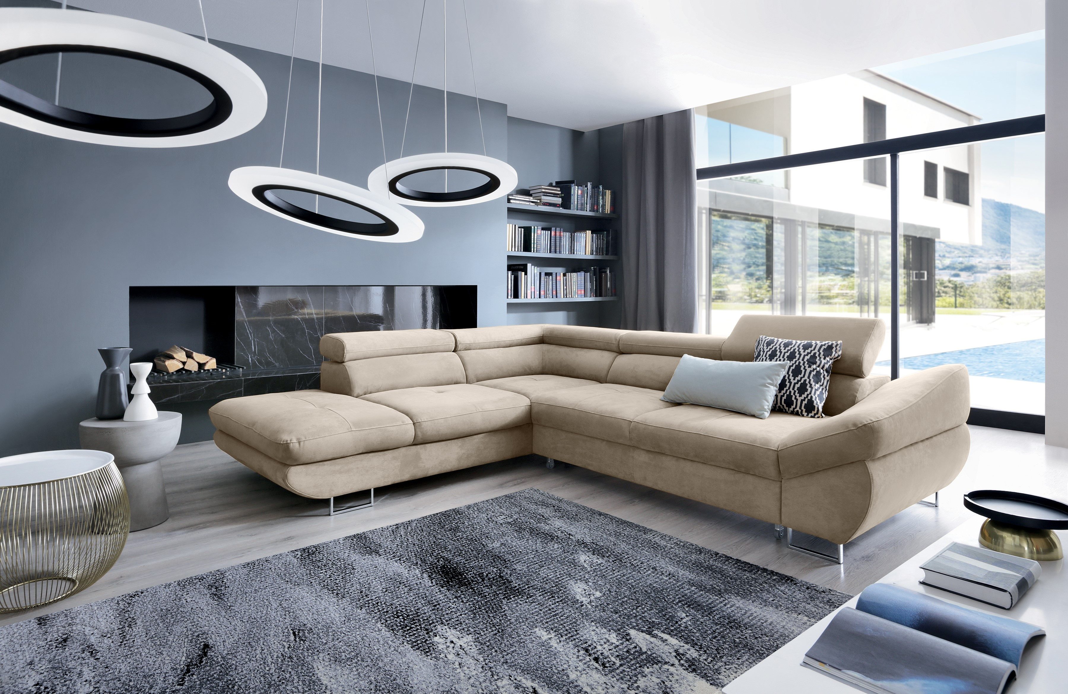 Ecksofa Fabio ist von hoher Qualität und moderner Form mit ästhetischen Proportionen. Verstellbare Kopfstützen ermöglichen bequemes Ausruhen, die profilierte Armlehne bietet Ihnen die Möglichkeit, sich im Sitzen und Liegen auszuruhen. Chrombeine betonen die moderne Form. Die Schlaffunktion bietet die Möglichkeit, für zwei Personen zu schlafen, der Behälter für die Bettwäsche lässt sich öffnen und ist aus starkem, langlebigem Material gefertigt.