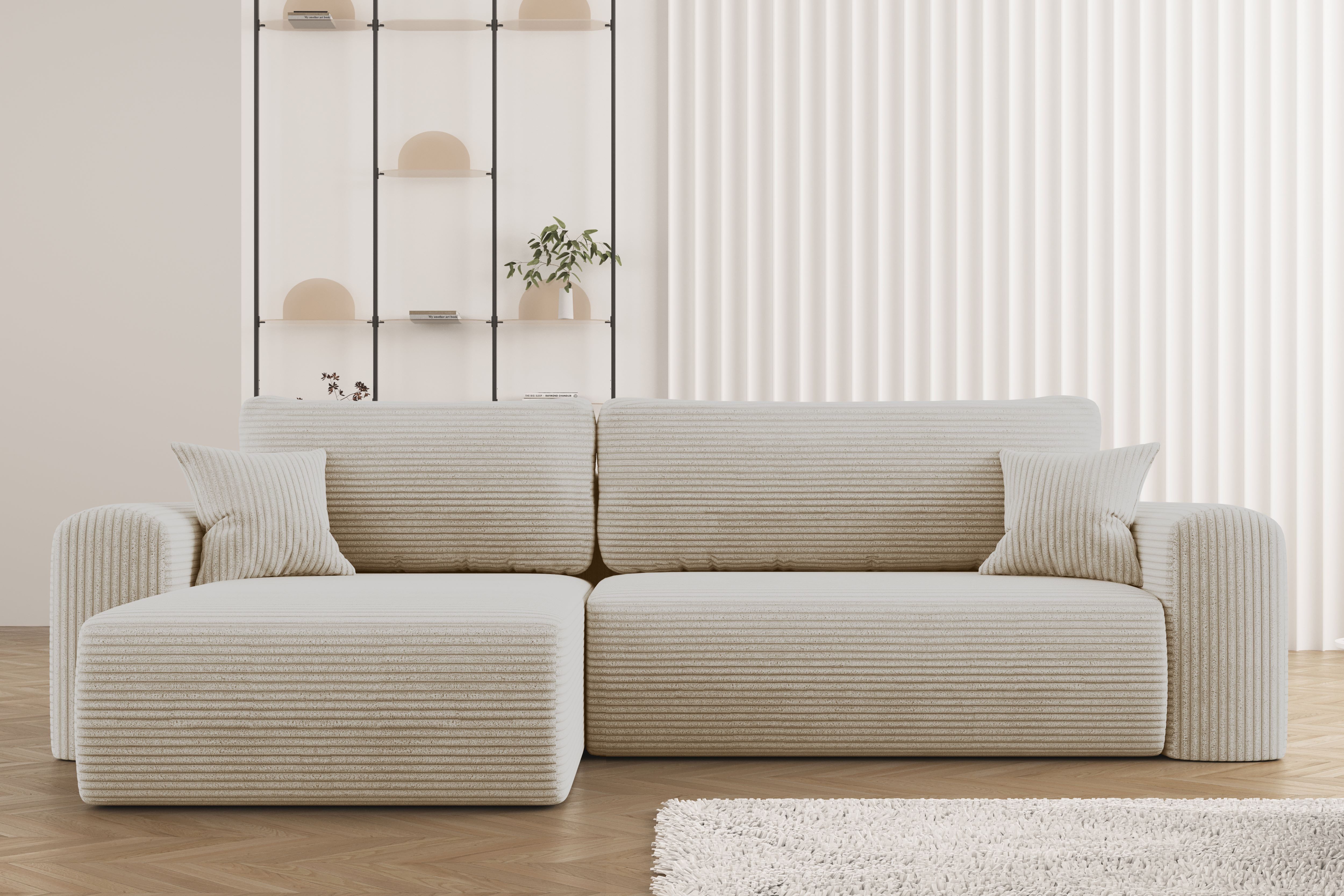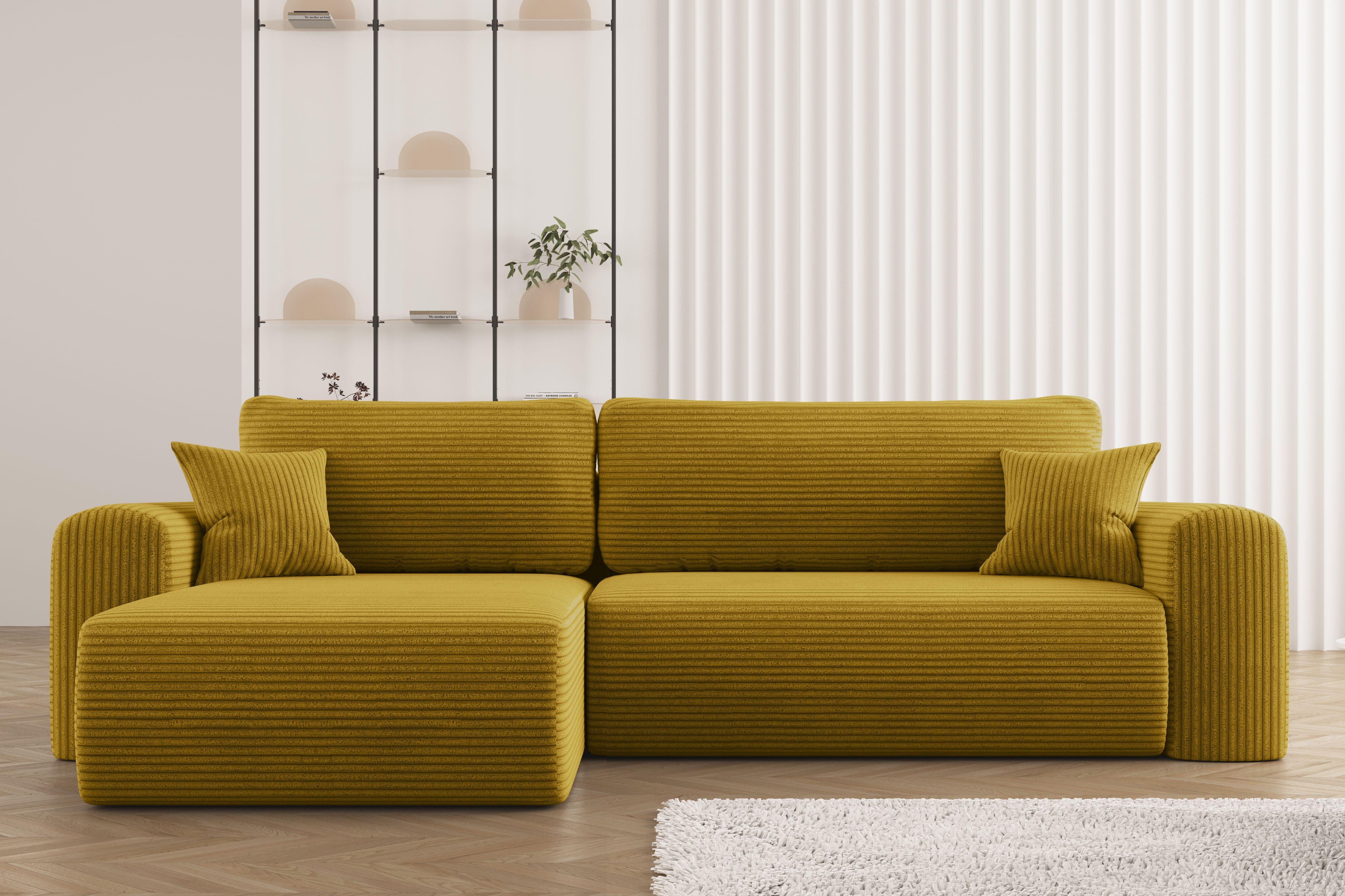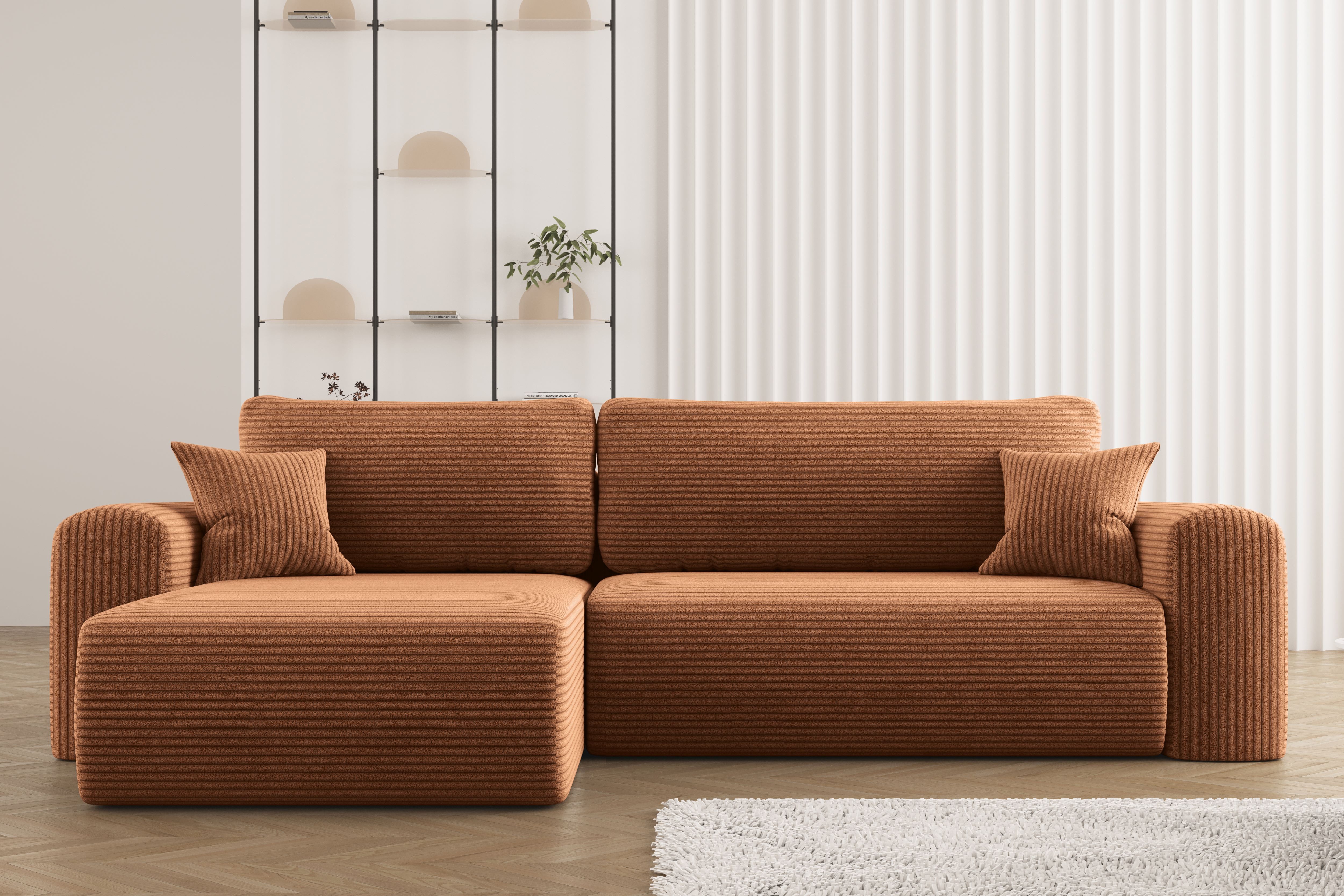 Das Ecksofa Capri mit Schlaffunktion und Stauraum für Bettzeug bietet eine perfekte Kombination aus Komfort und Eleganz. Dieses Cord Sofa L-Form ist ideal für moderne Wohnräume und schafft eine einladende Atmosphäre. Der hochwertige Cordstoff Poso verleiht dem Sofa eine luxuriöse Haptik und eine warme Optik, die jedes Wohnzimmer aufwertet. Mit seiner L-Form bietet dieses Sofa nicht nur viel Platz zum Sitzen, sondern auch eine stilvolle Ergänzung für Ihre Einrichtung. Die weiche und strapazierfähige Oberfläche des Cordstoffs sorgt für ein angenehmes Sitzgefühl und hohe Langlebigkeit.