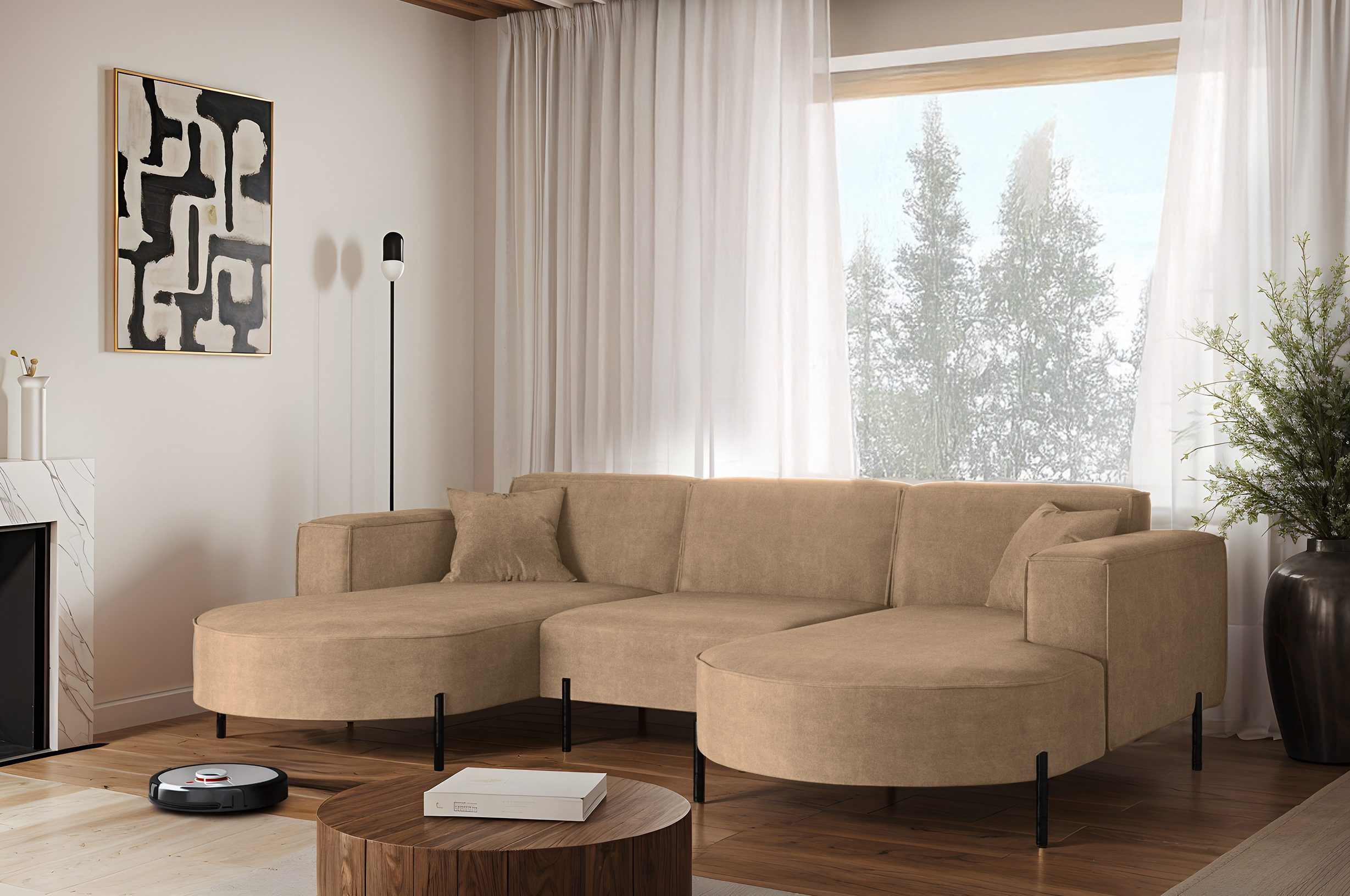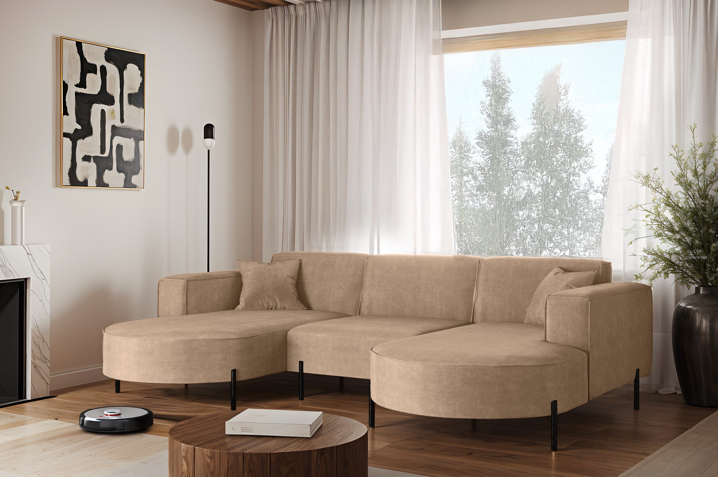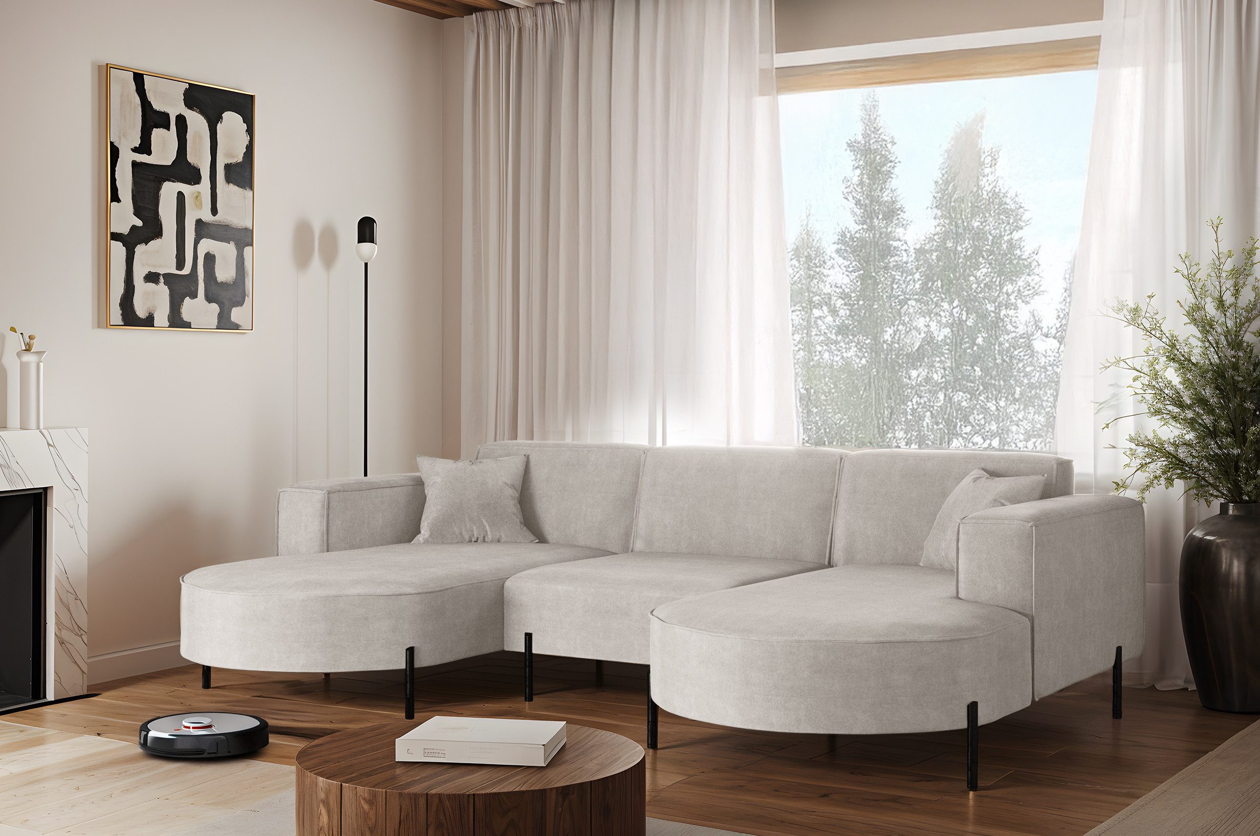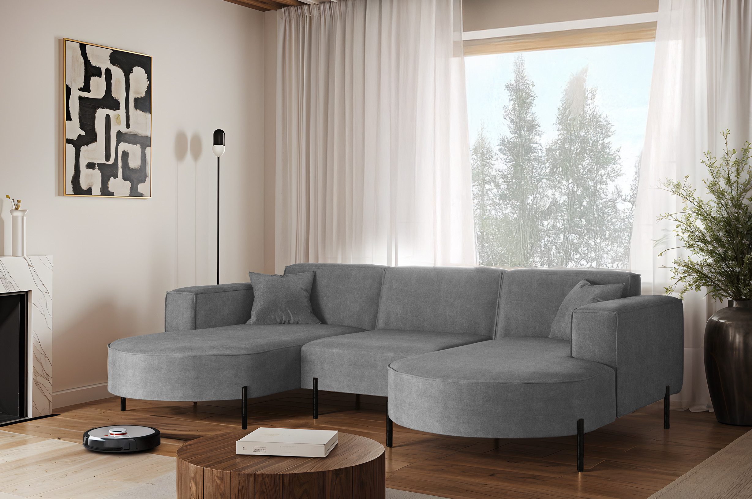 Das stilvolle Ecksofa MODENA U Rein vereint auf perfekte Weise Funktionalität, Eleganz und Komfort. Jedes Detail dieses Möbelstücks wurde sorgfältig durchdacht, um maximale Zufriedenheit bei der Nutzung zu gewährleisten. Dank der massiven Holzkonstruktion ist das Ecksofa stabil und langlebig, was sich in seiner langen Lebensdauer widerspiegelt. Das zeitlose Design macht das Sofa zu einem echten Blickfang, der sich harmonisch in verschiedene Einrichtungsstile einfügt – nicht nur im Wohnzimmer. Zusätzlich ist es mit Metallfüßen mit ausgestattet, unter denen problemlos ein Saugroboter Platz findet. Dadurch lassen sich Staub und Schmutz mühelos entfernen, ohne dass Sie eingreifen müssen.