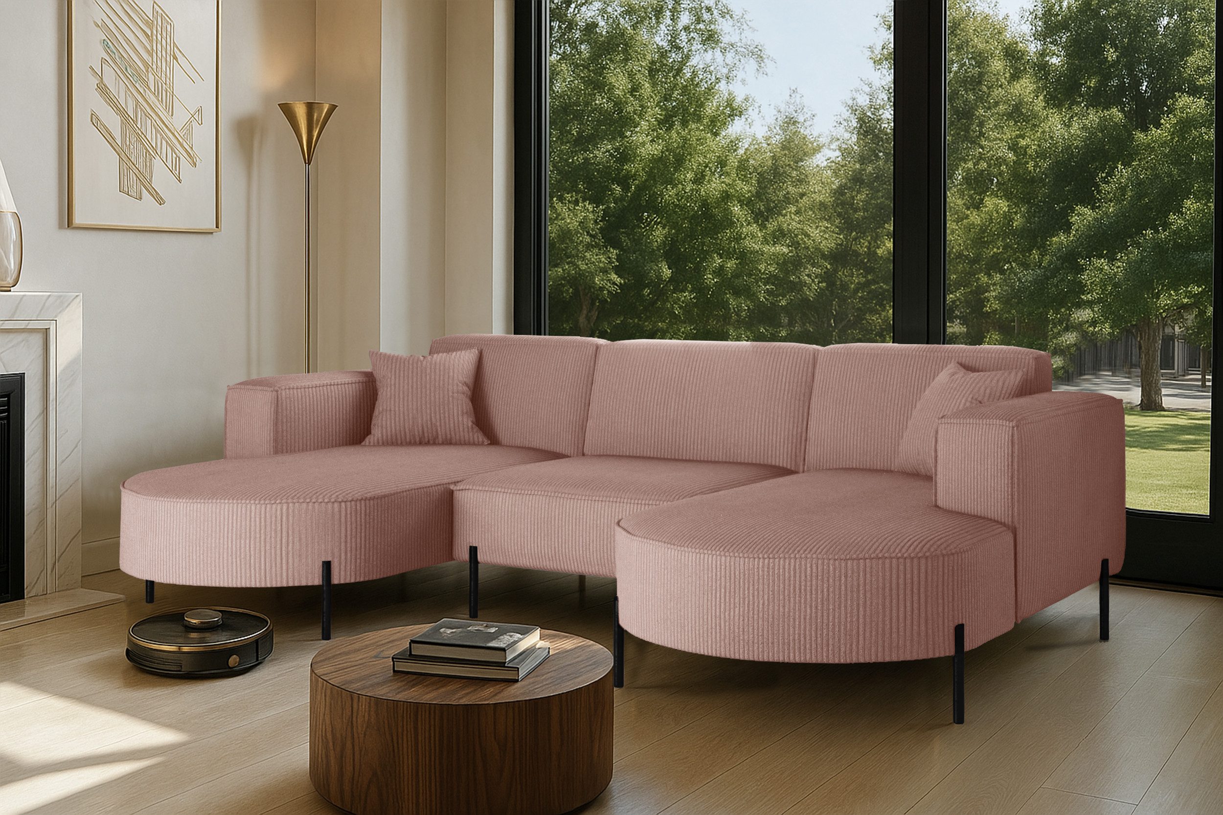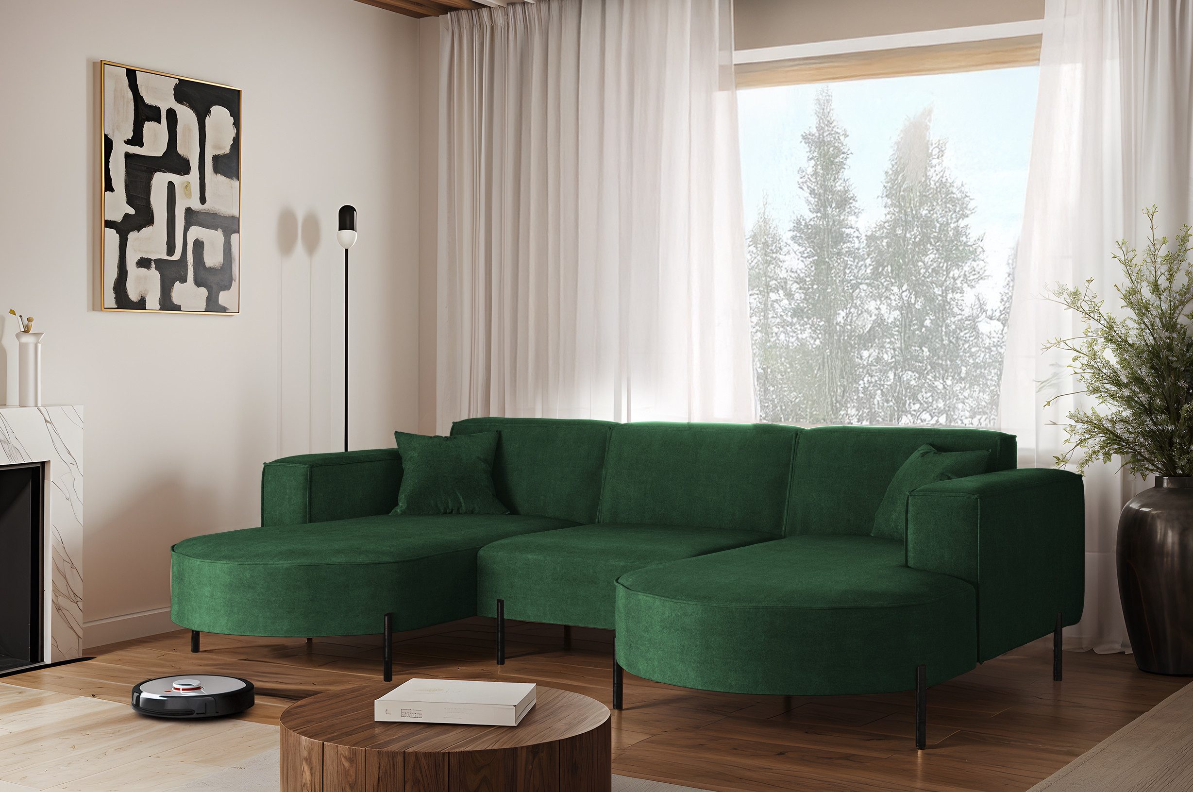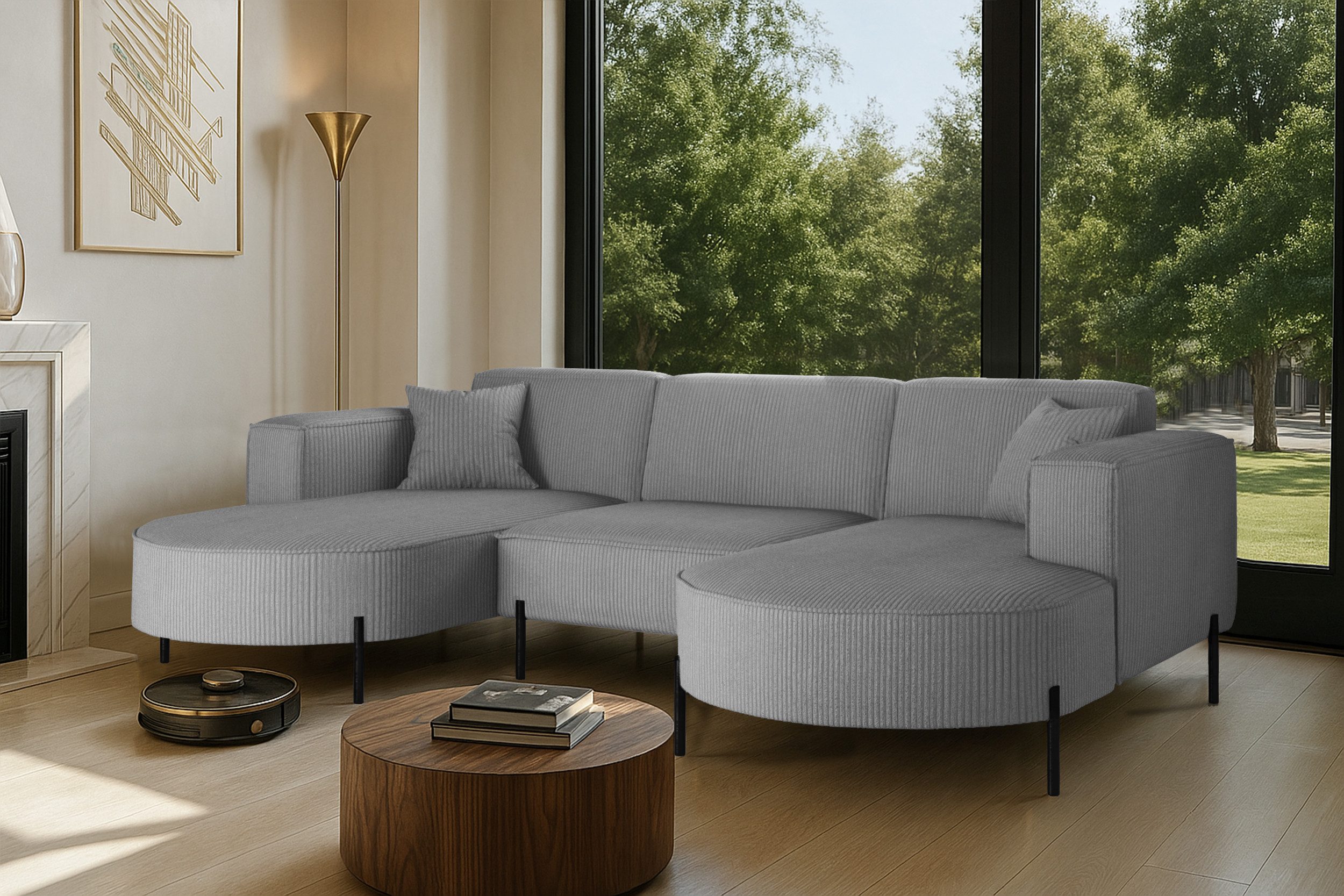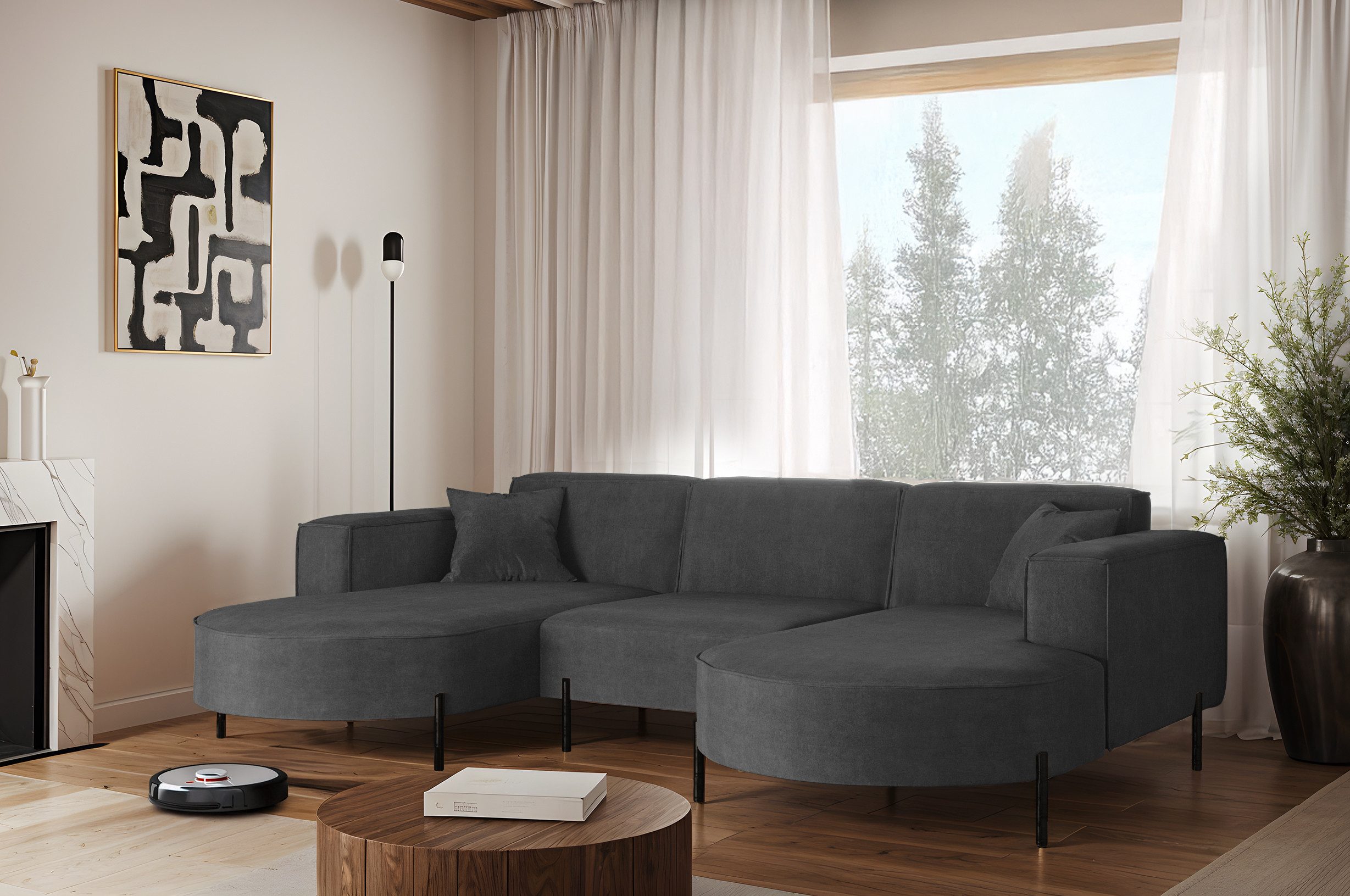 Das stilvolle Ecksofa MODENA U Rein vereint auf perfekte Weise Funktionalität, Eleganz und Komfort. Jedes Detail dieses Möbelstücks wurde sorgfältig durchdacht, um maximale Zufriedenheit bei der Nutzung zu gewährleisten. Dank der massiven Holzkonstruktion ist das Ecksofa stabil und langlebig, was sich in seiner langen Lebensdauer widerspiegelt. Das zeitlose Design macht das Sofa zu einem echten Blickfang, der sich harmonisch in verschiedene Einrichtungsstile einfügt – nicht nur im Wohnzimmer. Zusätzlich ist es mit Metallfüßen mit ausgestattet, unter denen problemlos ein Saugroboter Platz findet. Dadurch lassen sich Staub und Schmutz mühelos entfernen, ohne dass Sie eingreifen müssen.