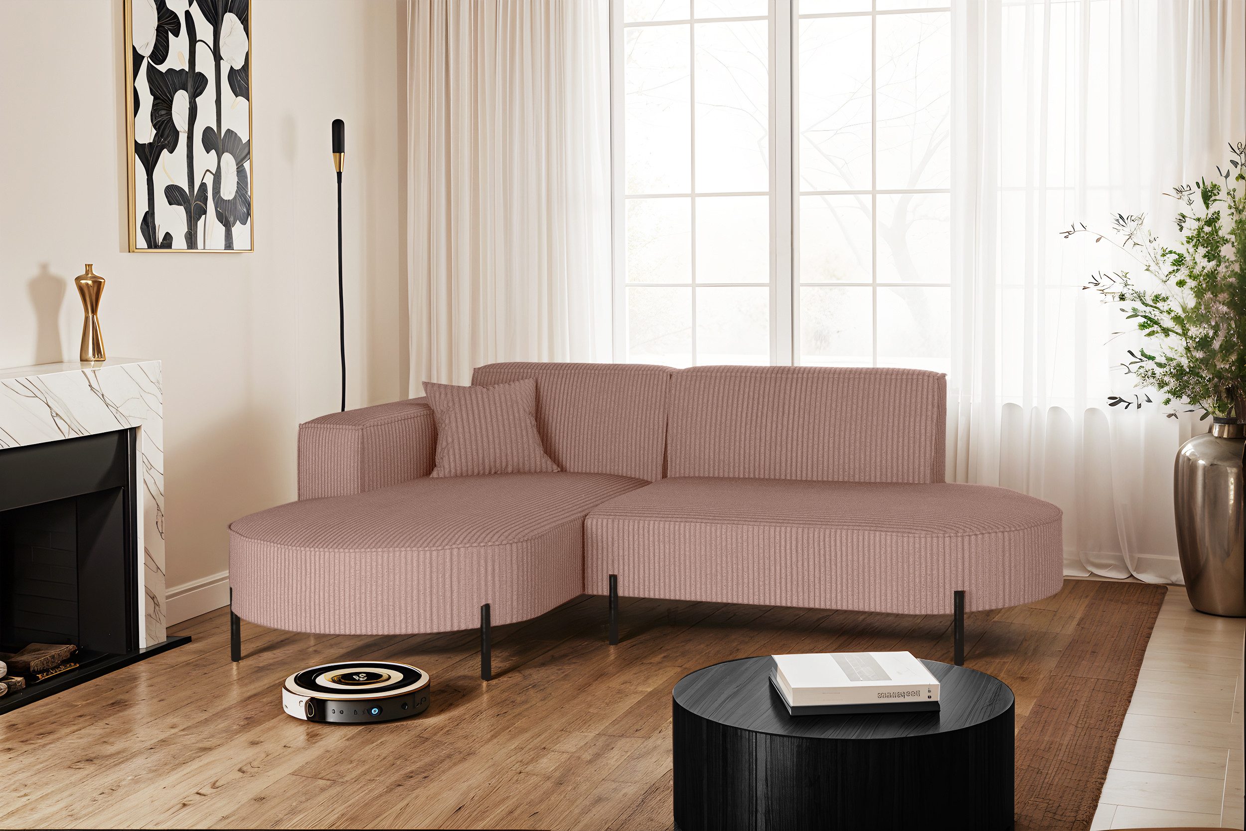 Das zeitlose Design macht das Sofa zu einem echten Blickfang, der sich harmonisch in verschiedene Einrichtungsstile einfügt – nicht nur im Wohnzimmer. Zusätzlich ist es mit Metallfüßen mit goldenen Verzierungen ausgestattet, unter denen problemlos ein Saugroboter Platz findet. Dadurch lassen sich Staub und Schmutz mühelos entfernen, ohne dass Sie eingreifen müssen.