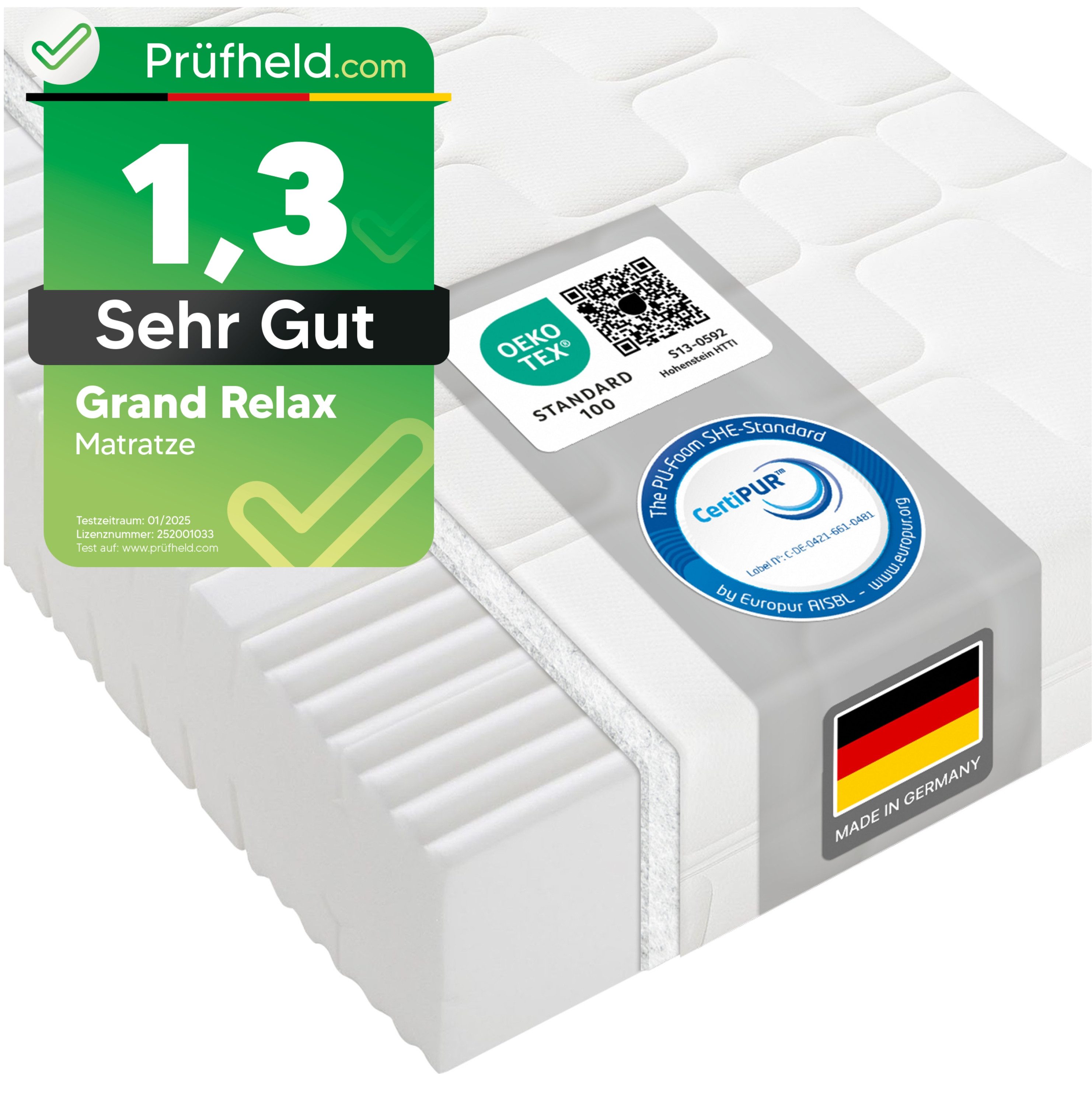 Die Kaltschaummatratze BeCo Grand Relax bietet dank einer luxuriösen Gesamthöhe von ca. 25 cm ein Boxspring-Feeling wie im Luxus-Hotel. Der Kaltschaum-Matratzenkern mit innovativer Kerntechnologie unterstützt die nächtliche Wirbelsäulenstreckung optimal. Durch die unterschiedlich tiefen Vertikaleinschnitten im Komfortschaum-Kern kommen die 7 Liegezonen für jeden Schlaftyp optimal zur Geltung und sorgen für eine körpergenaue Anpassung sowie ergonomischen Schlaf. Tiefere Einschnitte in der Schulter-Zone lassen die Schulter besonders weich einsinken und beugen damit Verspannungen vor. Kleinere Einschnitte im Beckenbereich sorgen dagegen für eine festere Unterstützung des Beckens und mindern dadurch Rückenbeschwerden. Das offenporige und atmungsaktive Material sichert zudem ein angenehmes Schlafklima. Dank beidseitig gleicher Stützkraft kann die Matratze regelmäßig gewendet werden und bietet dabei einen gleichbleibenden Schlafkomfort. Das Wenden der Matratze fördert die Hygiene und Langlebigkeit. Zur individuellen Abstimmung gibt es die Grand Relax in drei verschiedenen Härtegraden. Der klima- und feuchtigkeitsregulierende Matratzenbezug ist abnehmbar und bis zu 60°C waschbar. Durch den Rundum-Reißverschluss lässt sich der Bezug einfach in zwei Hälften teilen und passt so in jede haushaltsübliche Waschmaschine. Vier stabile Wendegriffe erleichtern das Handling der Matratze im Alltag. Der hautfreundliche Doppeltuch-Bezug ist mit einer atmungsaktiven Klimafaser versteppt und medizinisch getestet. Die Matratze Grand Relax ist ein Qualitätsprodukt der Marke BeCo und wird in aufwendiger Handarbeit gefertigt. 100% Made in Germany.