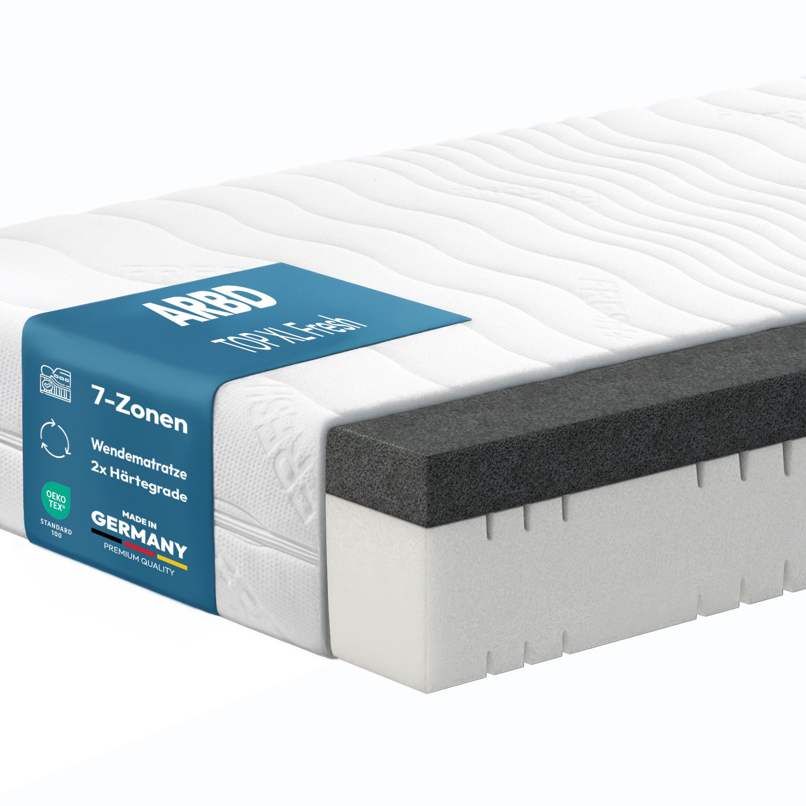 ARBD „TOP XL Fresh“ – 7‑Zonen‑Kaltschaummatratze mit integriertem Topper für höchsten Komfort Die ARBD „TOP XL Fresh“ vereint ergonomischen 7‑Zonen‑Komfort mit einem integrierten Topper – für ein traumhaft entspanntes Schlaferlebnis. Mit einer Gesamthöhe von ca. 24 cm bietet dieses Modell optimalen Liegekomfort und hervorragende Unterstützung für Rücken-, Seiten- und Bauchschläfer. Wendematratze mit variablen Härtegraden Dank der cleveren Wende‑Funktion können Sie zwischen zwei Härtegraden wählen (z. B. H3/H4 oder H4/H5). Ideal bei wechselnden Schlafbedürfnissen oder für Paare mit unterschiedlichen Vorlieben. Integrierter Topper für höchsten Liegekomfort Der fest integrierte, ca. 10 cm hohe Topper aus hochwertigem Kaltschaum verbessert die Druckentlastung spürbar und unterstützt die Wirbelsäule – ideal auch bei Rücken‑ oder Gelenkbeschwerden. 7‑Zonen‑Schnitt für ergonomische Körperanpassung Die spezielle Zoneneinteilung unterstützt jede Körperpartie individuell – Schulter, Hüfte und Wirbelsäule liegen ergonomisch korrekt, die Punktelastizität fördert eine gesunde Schlafhaltung. Atmungsaktiv & allergikerfreundlich Der offenporige Kaltschaumkern sorgt für eine gute Luftzirkulation und ein angenehm trockenes Schlafklima. Das hypoallergene Material bietet Hausstaubmilben kaum Chancen – ideal für Всеrgiker. Pflegeleichter Premium‑Bezug Der hautfreundliche Bezug aus 100 % Polyester ist versteppt und mit einem 4‑seitigen Reißverschluss versehen. Abnehmbar und waschbar bei 40 °C. Vakuumverpackt geliefert – schnell einsatzbereit Die Matratze wird platzsparend vakuumiert geliefert. Nach dem Auspacken entfaltet sie sich innerhalb von 24–48 Stunden vollständig. Erhältlich in vielen Größen – z. B. 90×200 cm oder 140×200 cm – Made in Germany von ARBD. Jetzt „TOP XL Fresh“ bestellen und komfortabel schlafen wie nie zuvor!