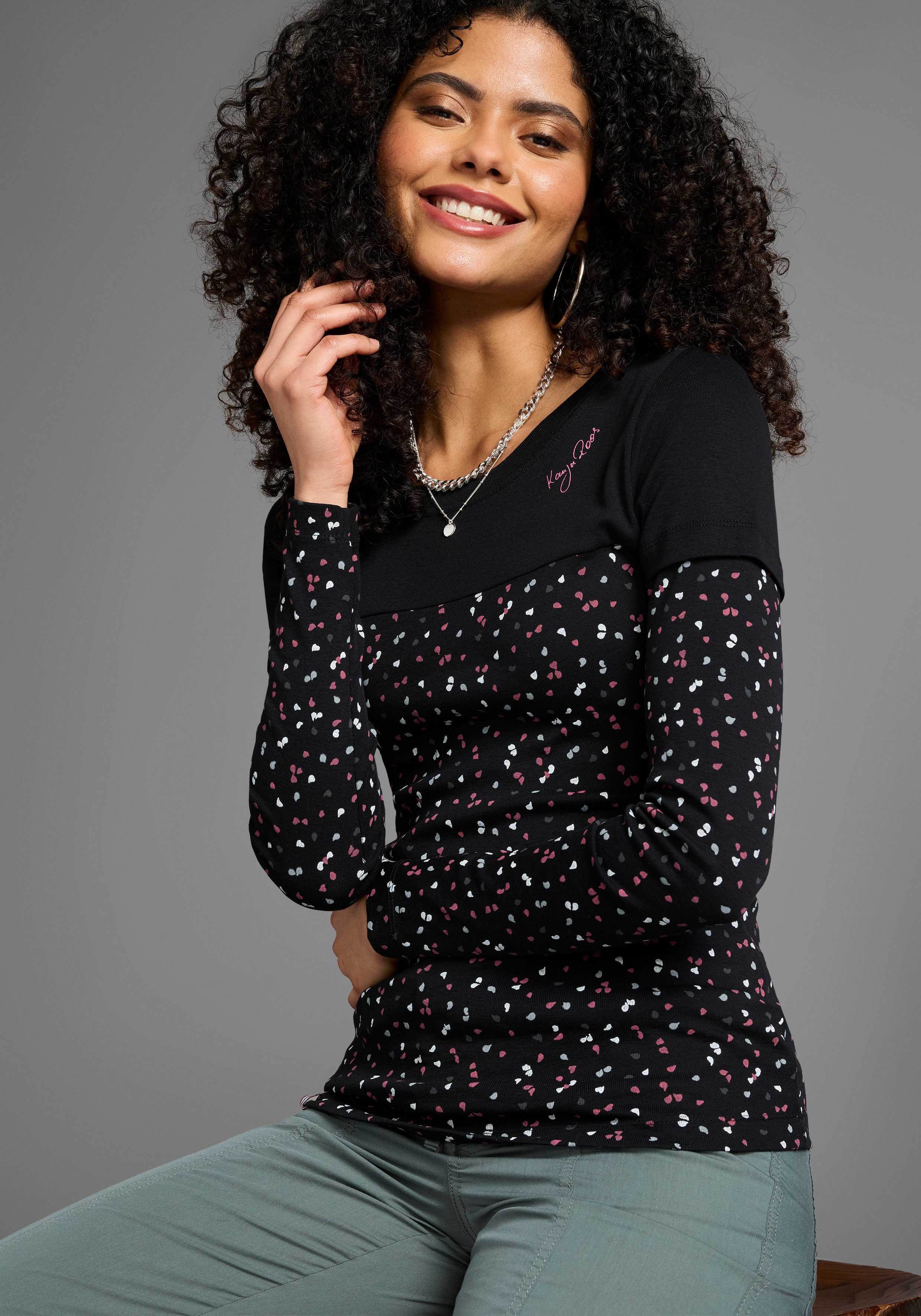Schau dir das 2-in-1-Langarmshirt von KangaROOS mal genauer an. Dieses Shirt ist figurbetont geschnitten, sodass es deinen Oberkörper schön zur Geltung bringt.