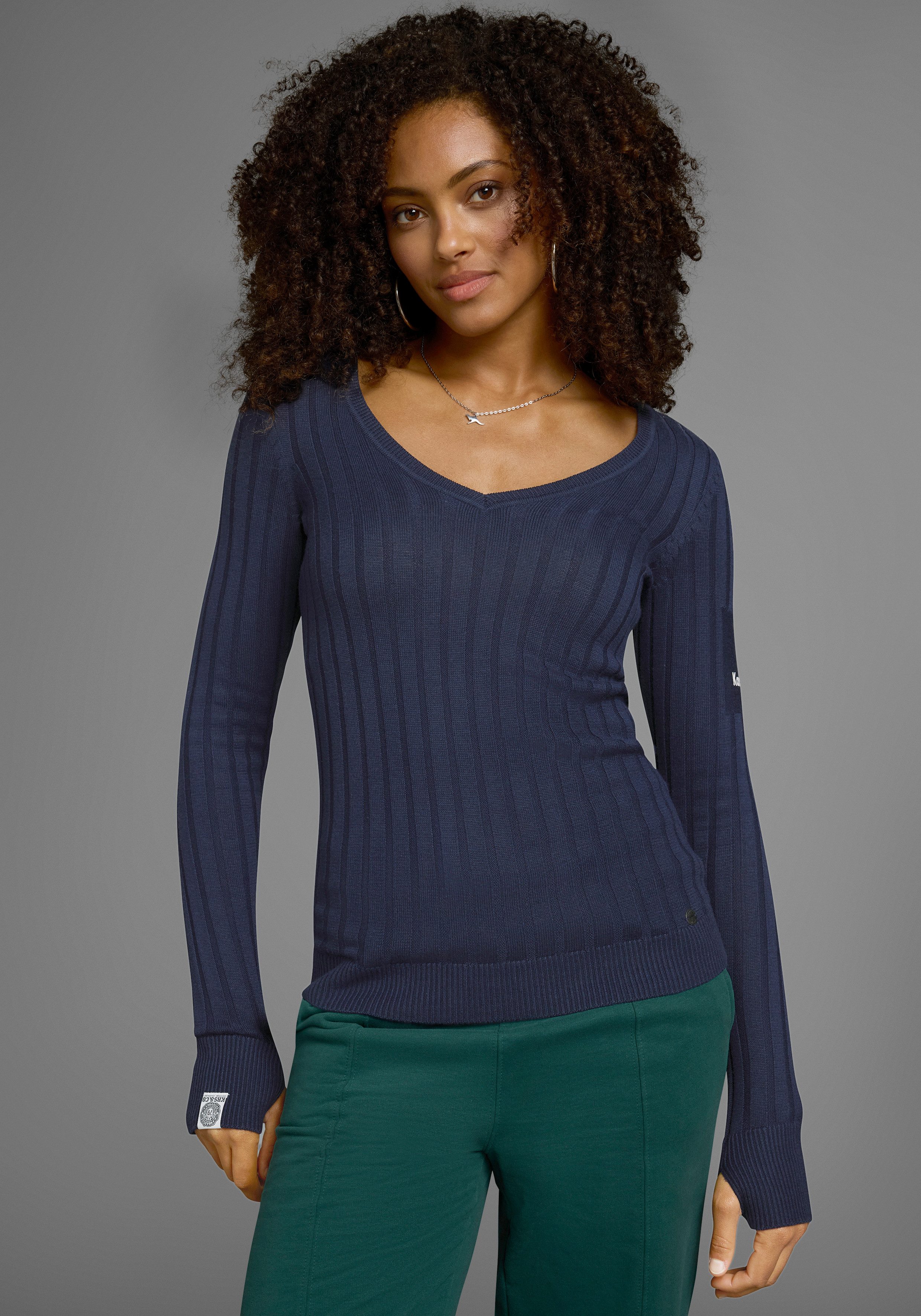 Mit dem V-Ausschnitt-Pullover von KangaROOS lassen sich einfach neue Styles kombinieren. Mit dem Markenlabel und dem Print sieht er lässig und peppig aus. Die langen Ärmel haben Daumenlöcher, die gleichzeitig den guten Sitz bieten und deine Handgelenke warm halten und enden in einem Rippbündchen, das für guten Sitz sorgt. Dieser Pullover ist hüftlang sowie sehr figurbetont geschnitten, sodass er deine Figur auf schöne Weise betont.