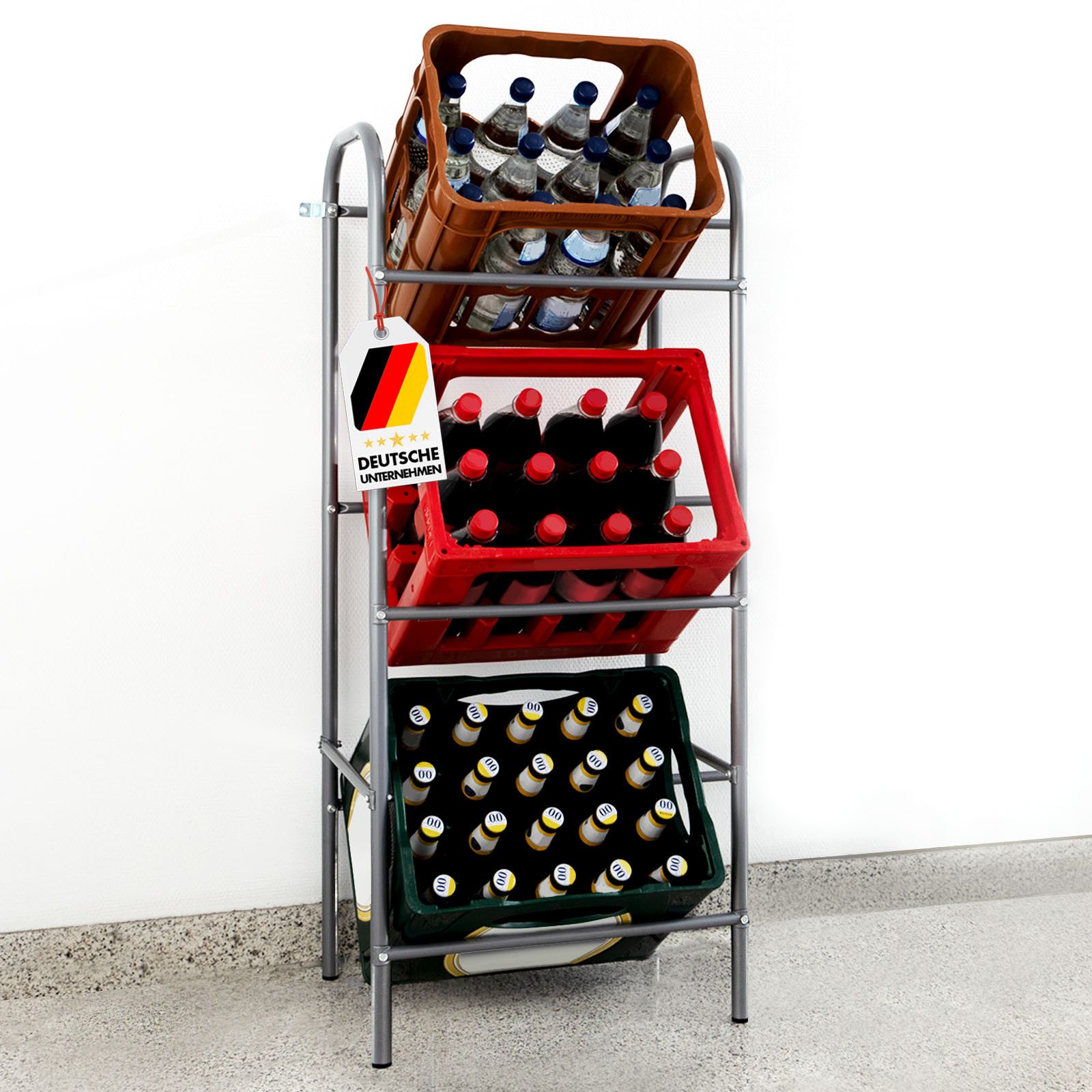 Wenn es um die Lagerung von Kisten geht, ist unser Flaschenkastenständer "Rocket" schon zur Stelle. Als einfache und praktische Lösung für das Verstauen Ihrer Getränkekästen passt das Produkt durch sein ansprechendes Design in jeden Haushalt. Zusätzlich lassen sich auch andere Boxen mit Lebensmitteln, Dekoartikeln oder Spielzeug zwischenlagern. Erhältlich in zwei Größen entscheiden Sie ganz einfach selbst, ob Sie lieber 3 oder 6 Kästen unterbringen wollen. So bietet Ihnen das Regal auf drei Ebenen den optimalen Stauraum, den Sie beliebig nutzen können. "Rocket" zeugt von einer besonderen Robustheit, wodurch auch beim Be- und Entladen ein sicherer Stand gewährleistet wird. Die Möglichkeit zur Befestigung an der Wand sorgt für zusätzliche Stabilität.