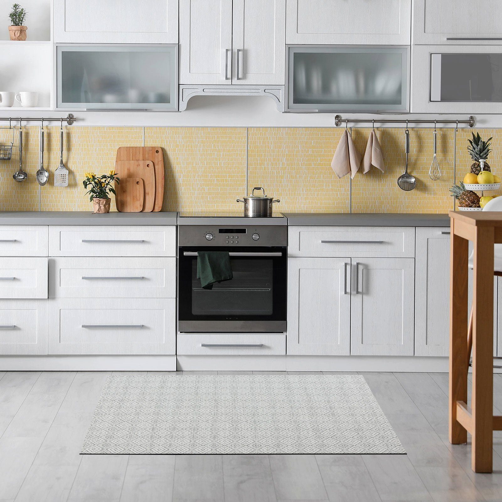 Dank diesem strapazierfähigen Küchen Läufer brauchen Sie sich um Fettflecken und Ölspritzer auf Ihrem schönen Stein- oder Holzboden keine Gedanken mehr machen. Der schwer entflammbare Küchen Teppich ist ein attraktives Wohnaccessoire für eine sichere und wohnliche Umgebung und besonders ideal für Kochstellen sowie vor Backöfen. Gefertigt aus einem hochwertigen Vinyl-Polyester-Mix, ist die strukturierte Oberfläche bei diesem Läufer widerstandsfähig und sowohl Fett- als auch Nässe-unemfindlich. Die rutschhemmende Rückseite aus langlebigem PVC und das hohe Eigengewicht verhindern ein Verrutschen und sorgen dafür, dass der Küchenläufer immer an der gewünschten Position liegen bleibt. Aufgrund des festen Gewebes ist der Läufer stuhlrollengeeignet - es ist also bedenkenlos möglich, auch einen Küchenwagen oder Einkaufstrolley auf dem Bodenbelag zu nutzen, ohne Beschädigungen befürchten zu müssen.