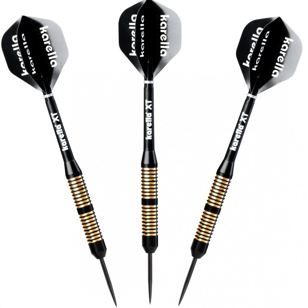 Die Karella XT-Serie als Steel- und Softdart verbindet Design und Qualität bei einem unschlagbaren Preis-Leistungs-Verhältnis. Der Karella XT-6 Steel sorgt mit seiner eleganten Erscheinung für Aufsehen am Board. Der hochwertig beschichtete schwarz- und goldfarbene Messingbarrel bietet dem Spieler einen einfachen, aber effektiven Grip. Dank der ausgeprägten Ringstruktur liegt der Dart sehr gut in der Hand. Kombiniert mit den farblich passenden 100 Mic. starken XT-Profi Flights sowie den schwarzen Karella XT-Schäften (Medium) stellt derXT-6 nicht nur optisch ein absolutes Highlight dar. Verpackt ist das Set in einem schönen Blister inklusive Darthalter.