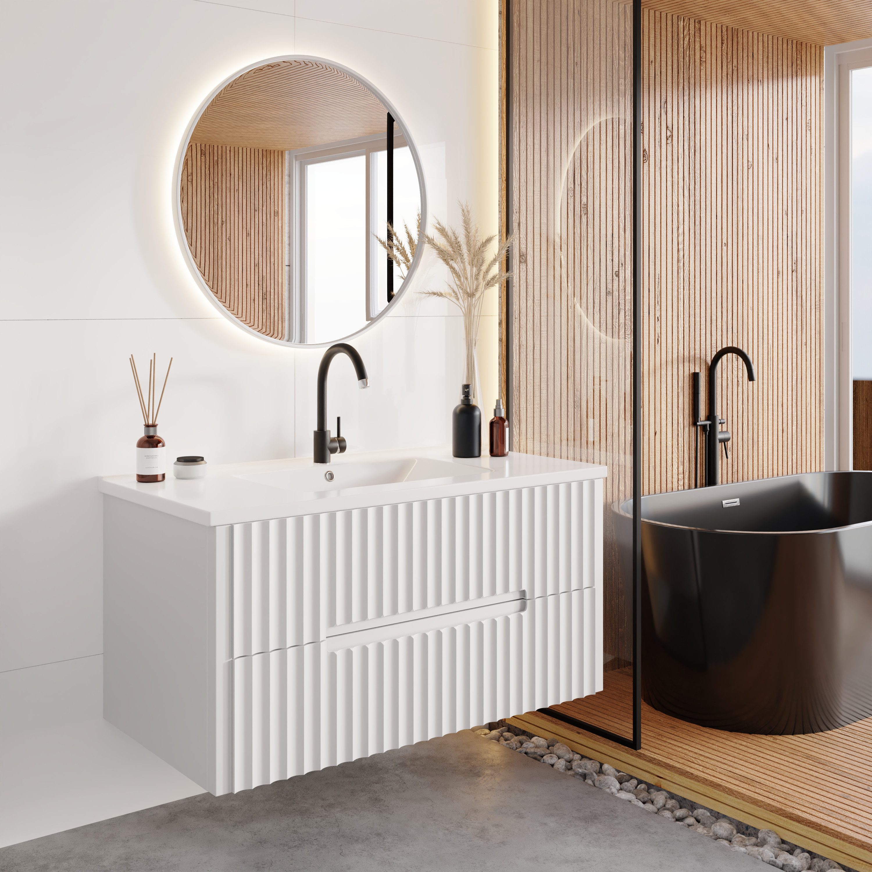 Die hängende Badkommode bietet optimale Aufbewahrung von Handtüchern und Pflegeartikeln. Die geriffelte Schubladenfronten verleihen der Badezimmermöbelgarnitur einen außergewöhnlichen Charakter, während Softclose Schienen ein ergonomisches Handling des Hängeschranks gewährleisten. Der Spiegel, der mit LED-Beleuchtung kommt, veredelt die glänzenden Badezimmerschränke und den Waschtisch mit Unterschrank 100 cm. Durch die Ablageflächen am Waschbecken am Waschbecken mit Unterschrank 80 cm und dem geräumigen Innenleben des wandmontierten Waschtischunterschrank 100 cm wird der Raum im Bad maximiert.