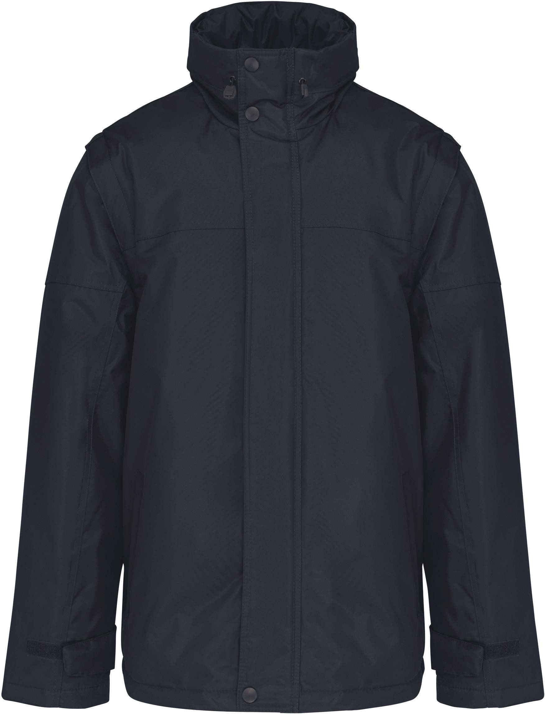 Außen: 100% Polyester -Beschichtung innenseitig. Innenfutter: 100% Polyester und 100% Polyesterwattierung. Reißverschluss + Druckknopfleiste - abtrennbare Ärmel. Armabschluss mit Klettverschluss. 2 Seitentaschen. Kapuze im Kragen mit Reißverschluss. 2 Innentaschen mit Reißverschluss. 1 Handytasche. Kordelzug mit Stoppern am Bund. Zugang mittels Reißverschluss für leichtes Veredeln.