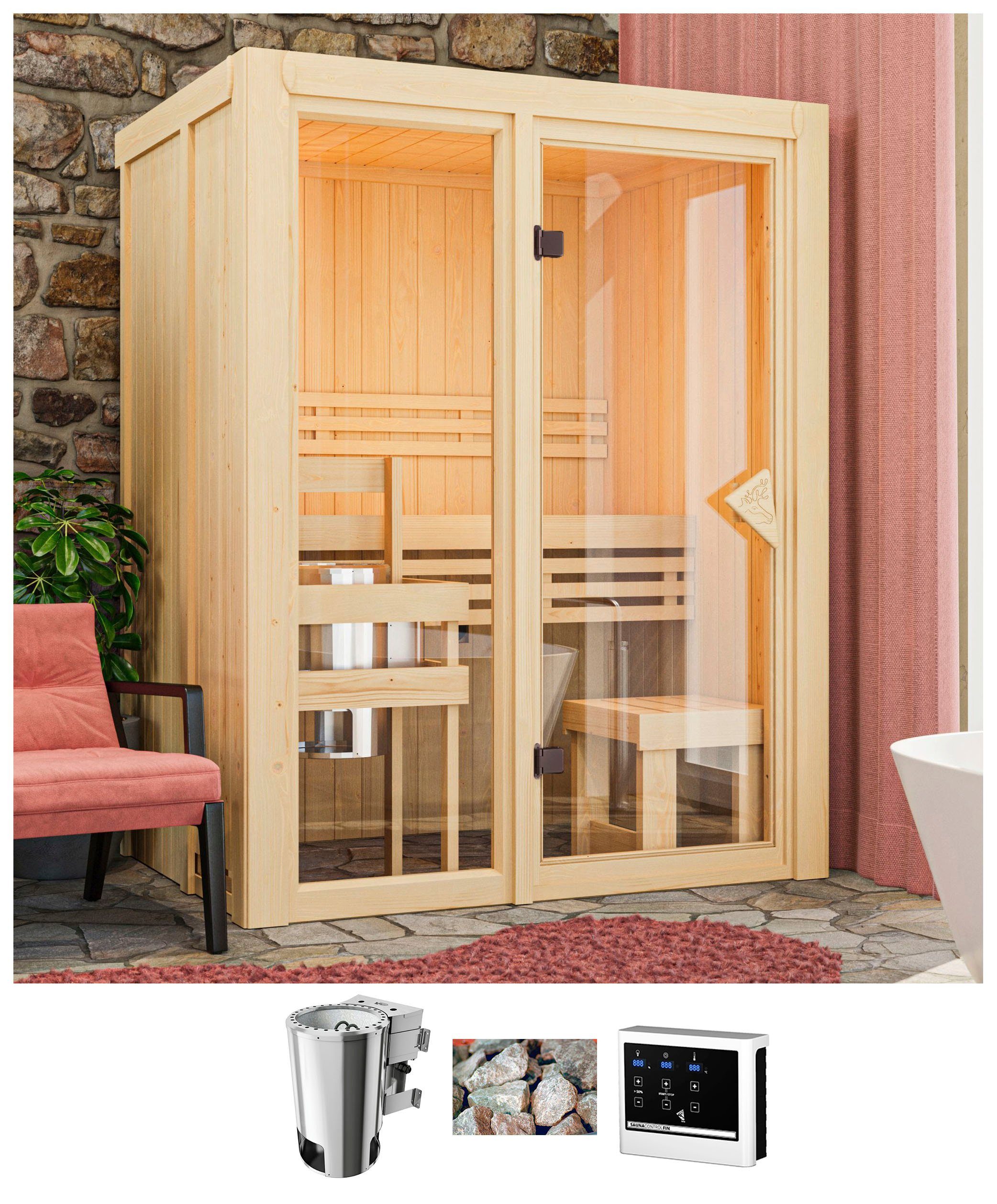 Karibu Sauna Alani 1, BxTxH: 155 x 122 x 198 cm, 68 mm, mit Ofen 3,6 kW Bio ext. Strg.