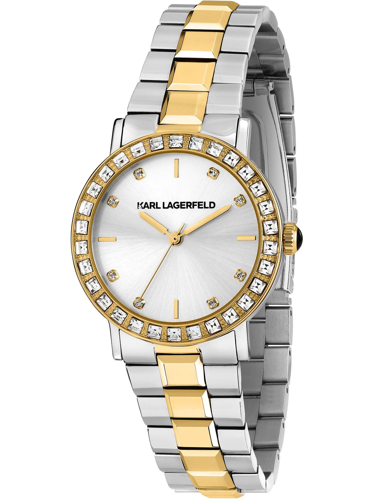 Karl Lagerfeld Uhren sind Ausdruck von ikonischem Design und untrüglichem Stil. Mit ihren markanten Details sind sie die perfekte Wahl für alle, die ein Statement setzen und ihren individuellen Look unterstreichen wollen. Ein sportlich-eleganter Klassiker ist diese Damenuhr mit Edelstahl-Gehäuse an einem unkomplizierten Edelstahl-Band. Die Karl Lagerfeld Crystals ist silbern mit einem goldenen Armband und einem silbernen Ziffernblatt. Назадhaltend, aber nicht unauffällig nimmt das runde Gehäuse (Durchmesser: 33 mm) am Handgelenk Platz. Ein Quarzwerk der Marke Miyota sorgt für die nötige Präzision. Durch die Markierungen fällt die Orientierung auf dem Ziffernblatt leicht, so dass die Zeit gut ablesbar ist. Der Sonnenschliff entführt dich bei jedem Blick auf die Uhr in ein faszinierendes Lichtermeer. Das verwendete Mineralglas bietet eine gute Sicht und ist widerstandsfähig gegen alle Einflüsse, die bei normalem Gebrauch entstehen. Mit einer Wasserdichte von bis zu 50 Metern (5 Bar) kann der Zeitmesser sorglos auch beim Händewaschen und Baden getragen werden. Die Faltschließe erleichtert das Anlegen des Armbands und garantiert sowohl einen sicheren Halt als auch einen guten Sitz am Arm. Wer seinem Look eine stilvolle Note verleihen möchte, macht mit der Karl Lagerfeld Crystals Damenuhr definitiv alles richtig!