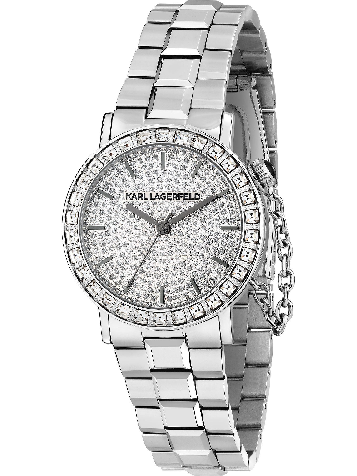 Karl Lagerfeld Uhren sind Ausdruck von Stil und ikonischem Design. Sie spiegeln die Vision des legendären Designers wider – edgy, modern und immer ein Blickfang. Mit diesen Uhren trägst du ein Fashion-Statement am Handgelenk. Diese sportlich-elegante Uhr am gleichermaßen schicken wie robusten Edelstahl-Band ist die perfekte Wahl für jede Frau, die auf der Suche nach einem zeitlosen Klassiker ist. Armband und Gehäuse der Karl Lagerfeld Crystals sind beide silbern, während das Ziffernblatt in Schwarz einen besonderen Akzent setzt. Das Gehäuse ist rund und hat einen Durchmesser von 33 mm, es sitzt dezent am Handgelenk. Im Inneren tickt ein zuverlässiges Miyota-Quarzwerk. Markierungen erleichtern die Orientierung auf dem Ziffernblatt und sorgen für gute Ablesbarkeit. Das Uhrenglas aus Mineralglas ist klar und robust – und damit perfekt für den Alltag. Dieser Zeitmesser ist mit einer Wasserdichtigkeit von 5 Bar ausgestattet, was bedeutet, dass er nicht nur Spritzwasser standhält, sondern auch einem wohltuenden Bad. Die Faltschließe garantiert sowohl ein leichtes Anlegen als auch einen sicheren Halt am Arm. Eins steht fest: Wer seinem Look eine individuelle Note verleihen möchte, macht mit der stilvollen Karl Lagerfeld Crystals Damenuhr alles richtig. Worauf wartest du also noch?