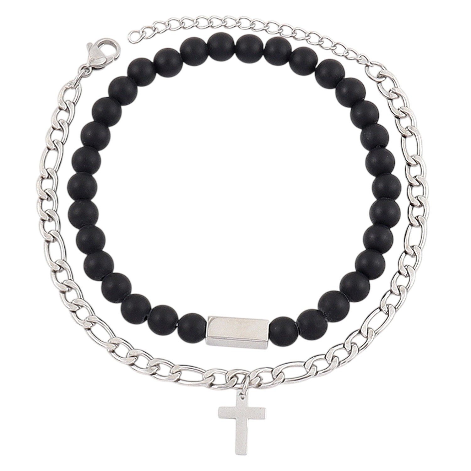 Stylisches 2er-Set: Schwarzes Gummiarmband & silberfarbenes Edelstahlarmband mit Kreuzanhänger – perfekt kombinierbar für Alltag und besondere Anlässe.