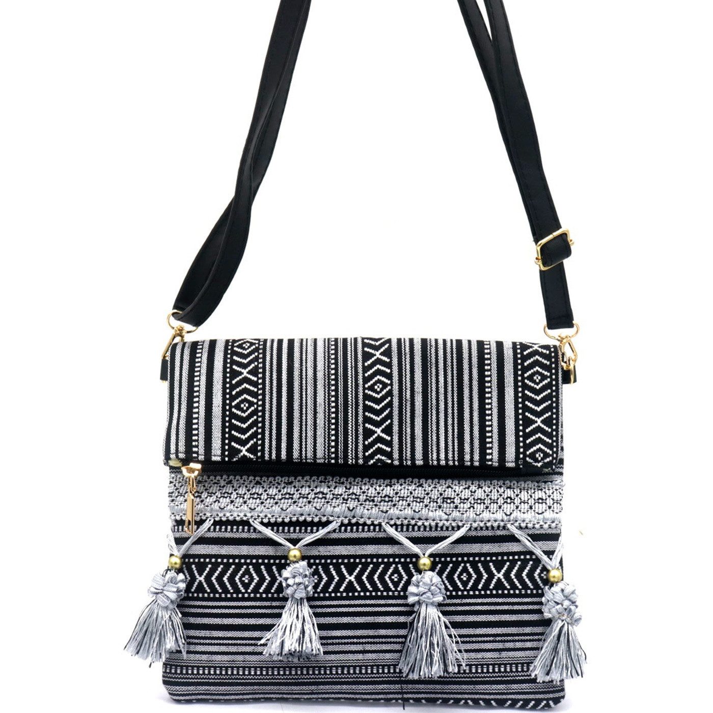 Das auffällige schwarz-weiße Muster in Kombination mit dekorativen Fransen und goldfarbenen Akzenten macht die Tasche zu einem stilvollen Hingucker. Sie lässt sich vielseitig kombinieren – ob zu Jeans, Kleid oder Mantel.