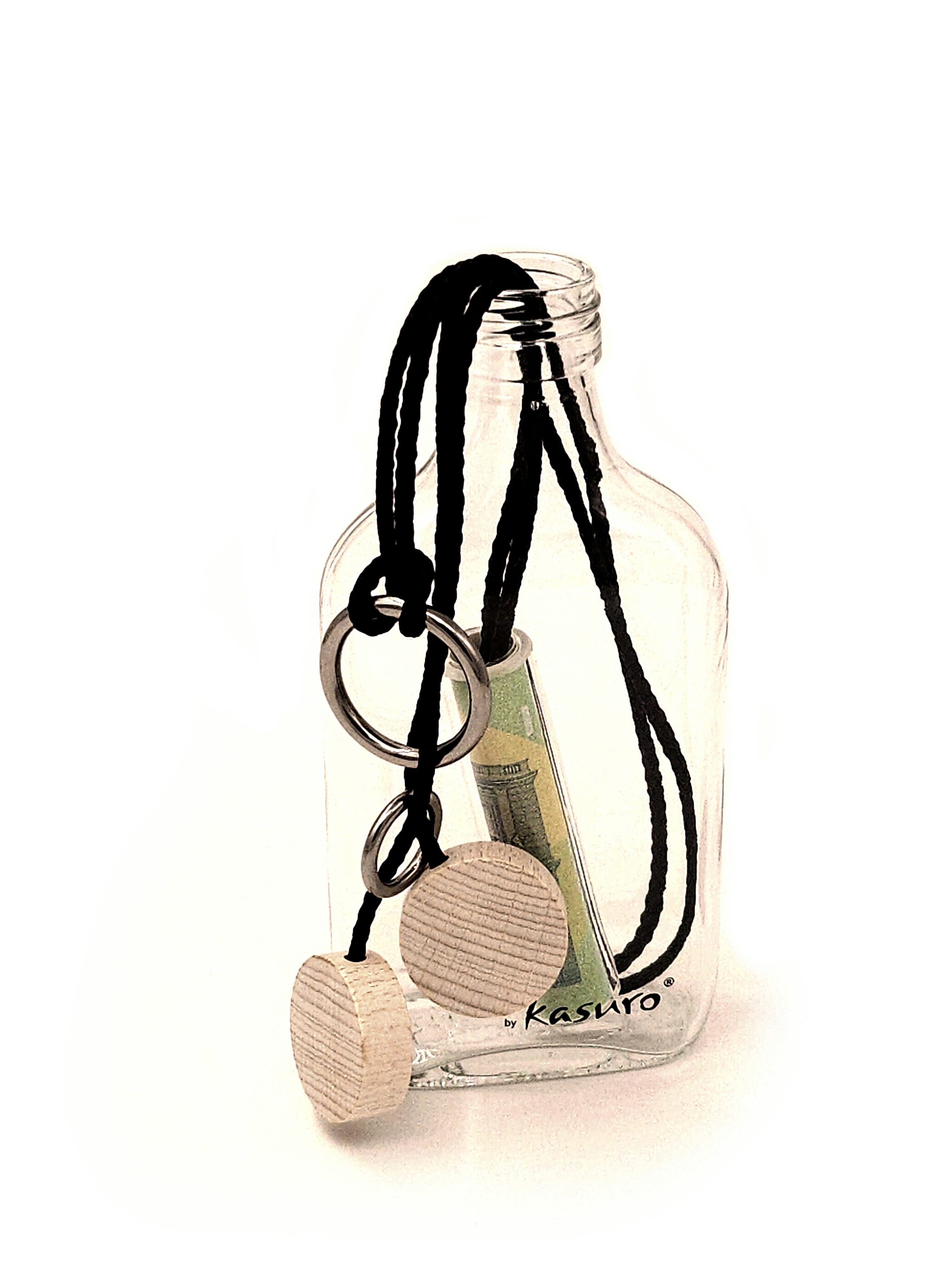 Lieferumfang | Glasflasche, Schnur mit Ringen und Holzenden, Acrylrohr, Anleitung |