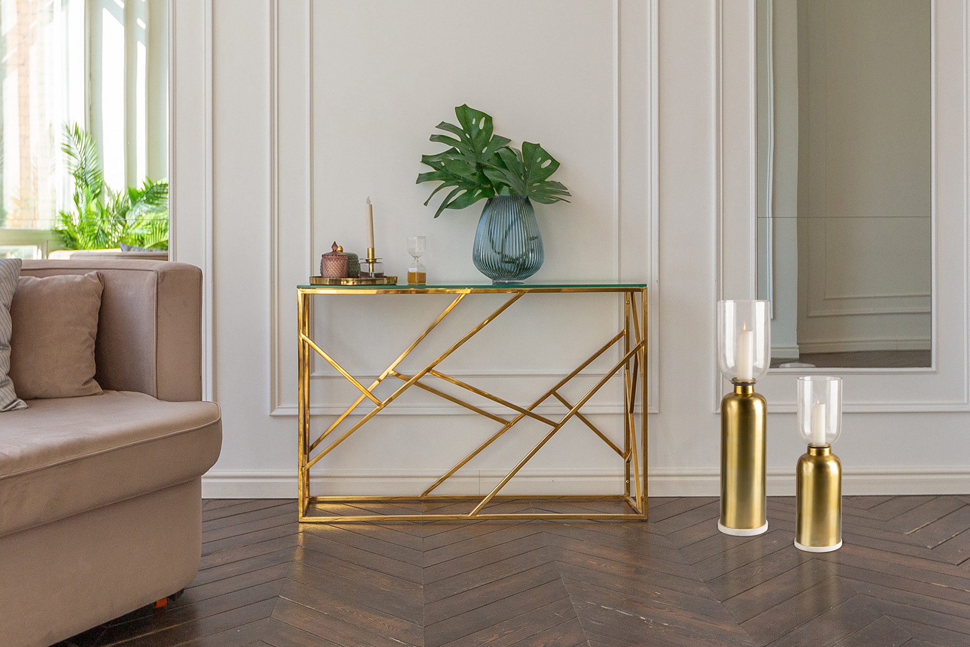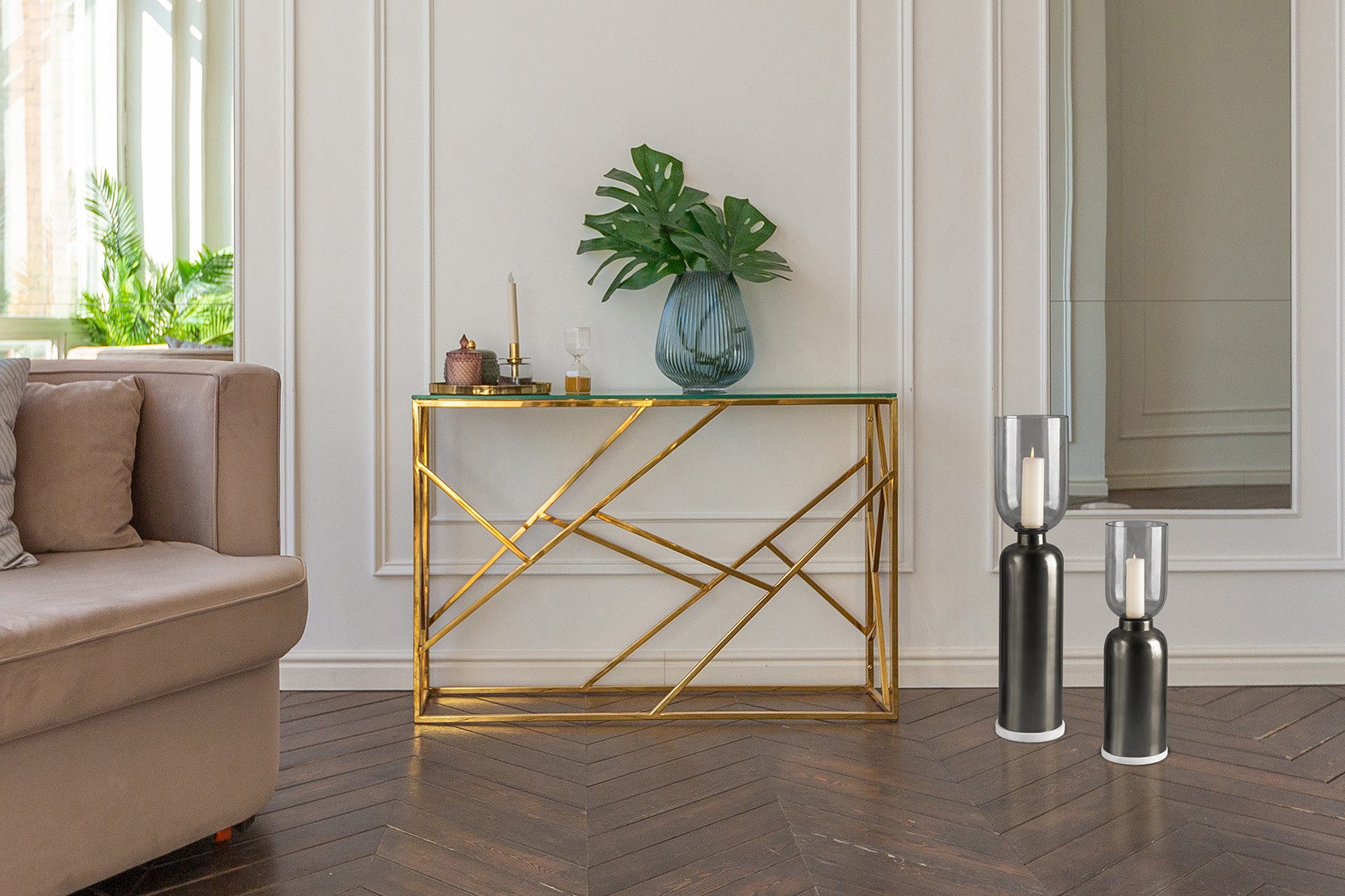 Bodenkerzenhalter aus Metall, Marmor-Sockel, Windlicht aus Glas